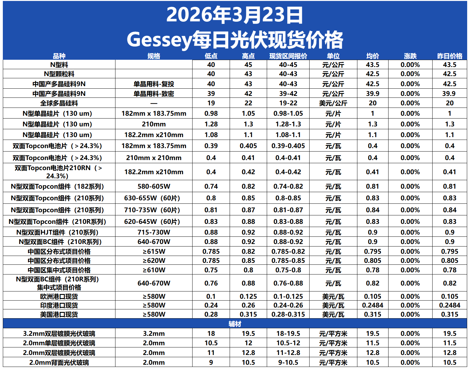 Gessey:2026年3月23日每日光伏市場(chǎng)行情2026-03-23 17:42來(lái)源:gessey蓋錫咨詢(xún)瀏覽數(shù):269次