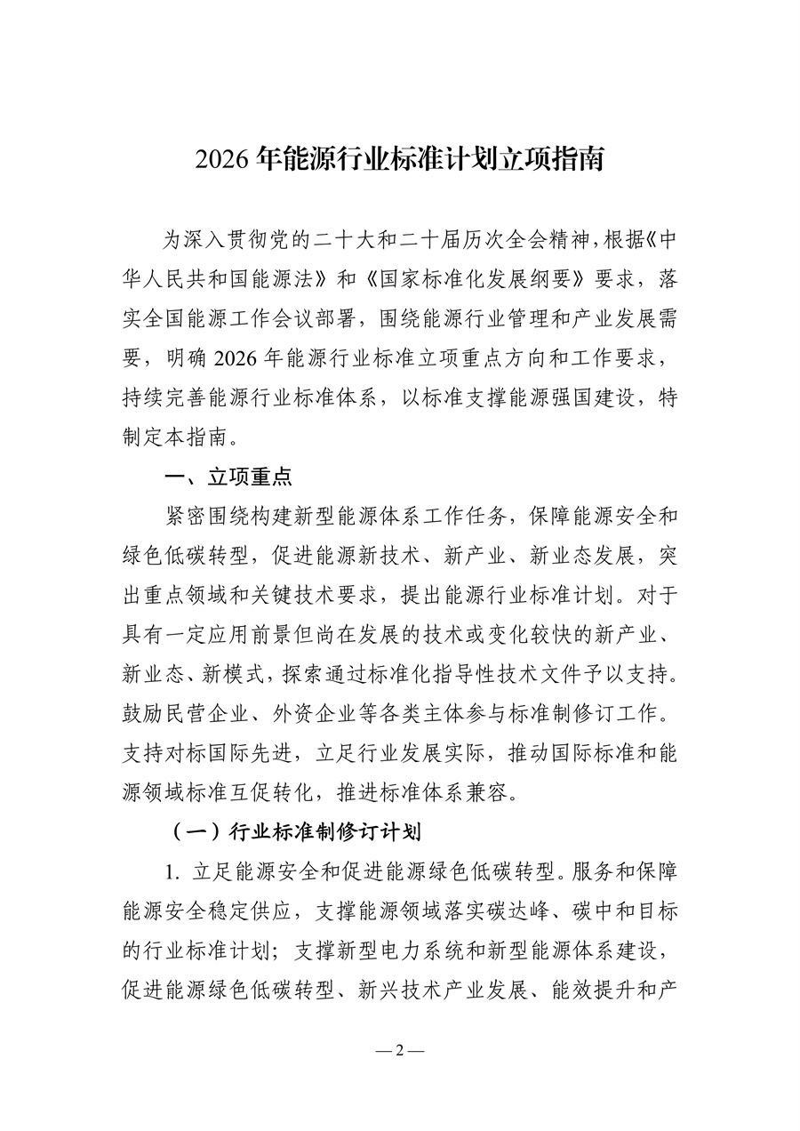 【政策重點(diǎn)提煉】國家能源局綜合司正式印發(fā)《2026年能源行業(yè)標(biāo)準(zhǔn)計(jì)劃立項(xiàng)指南》,圍繞構(gòu)建新型能源體系、保障能源安全、推動(dòng)綠色低碳轉(zhuǎn)型制定立項(xiàng)要求,明確行業(yè)標(biāo)準(zhǔn)制修訂、外文版翻譯兩大立項(xiàng)類型,覆蓋電力、核電、煤炭、油氣、新能源和可再生能源、新型儲(chǔ)能和氫能等九大領(lǐng)域,并劃定各領(lǐng)域細(xì)分專業(yè)方向與核心立項(xiàng)重點(diǎn)。指南鼓勵(lì)民企、外企等各類主體參與標(biāo)準(zhǔn)制修訂,支持對(duì)標(biāo)國際先進(jìn)、推動(dòng)中外標(biāo)準(zhǔn)互促轉(zhuǎn)化,同時(shí)明確申報(bào)材料、報(bào)送方式與項(xiàng)目管理細(xì)則,要求標(biāo)準(zhǔn)編制周期一般不超18個(gè)月,強(qiáng)化全生命周期管理,以標(biāo)準(zhǔn)體系完善支撐能源強(qiáng)國建設(shè)。