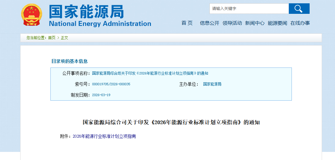2026能源行業(yè)標(biāo)準(zhǔn)立項(xiàng)指南發(fā)布,覆蓋九大領(lǐng)域明確重點(diǎn)方向國家能源局綜合司關(guān)于印發(fā)《2026年能源行業(yè)標(biāo)準(zhǔn)計(jì)劃立項(xiàng)指南》的通知2026-03-24 11:53來源:gessey蓋錫咨詢瀏覽數(shù):247次