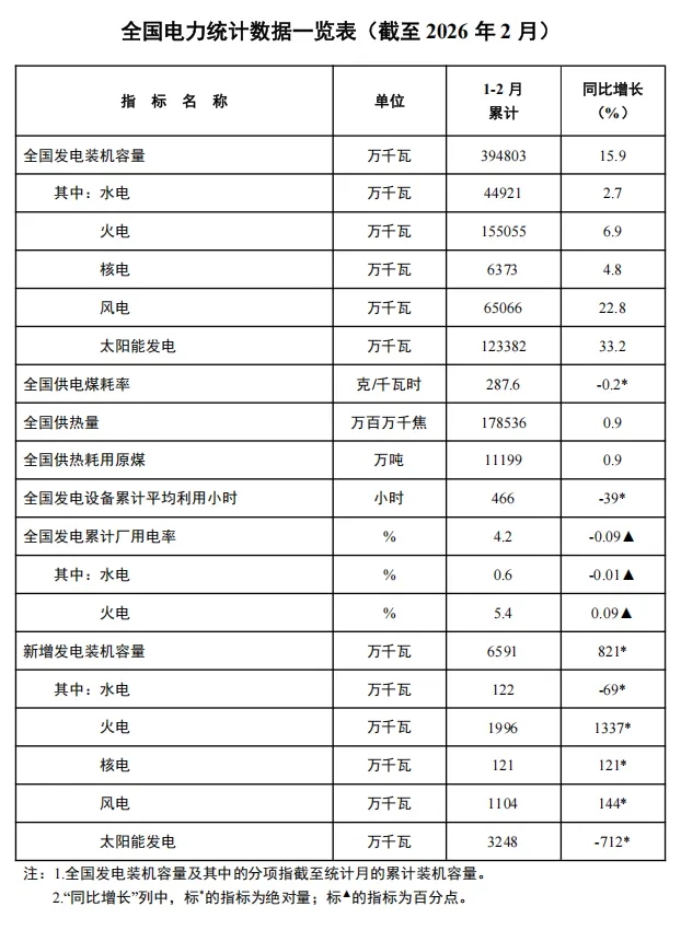 【核心數(shù)據(jù)提煉】3月25日國家能源局發(fā)布數(shù)據(jù):2月底全國累計發(fā)電裝機39.5億千瓦(同比增15.9%),太陽能發(fā)電12.3億千瓦(同比增33.2%)、風電6.5億千瓦(同比增22.8%),1-2月光伏新增32.48GW,發(fā)電設備利用466小時。 3月25日,國家能源局發(fā)布2026年1-2月份全國電力統(tǒng)計數(shù)據(jù)。 截至2月底,全國累計發(fā)電裝機容量39.5億千瓦,同比增長15.9%。其中,太陽能發(fā)電裝機容量12.3億千瓦,同比增長33.2%;風電裝機容量6.5億千瓦,同比增長22.8%。 1-2月份,全國發(fā)電設備累計平均利用466小時,比上年同期降低39小時。