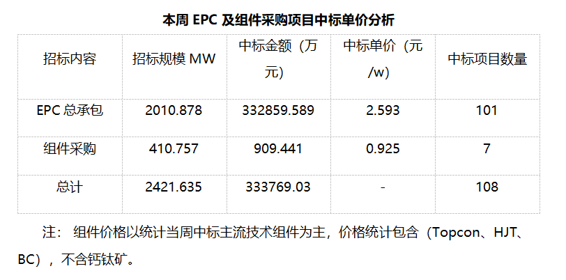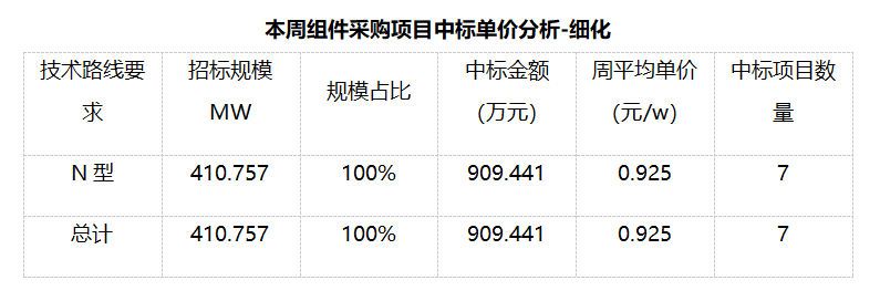 三、EPC總承包及組件采購情況匯總 本周光伏EPC總承包中標(biāo)規(guī)模達(dá)2010.878MW,總中標(biāo)金額332859.589萬元,平均中標(biāo)單價(jià)為2.953元/W,中標(biāo)數(shù)量101個。 本周光伏組件采購中標(biāo)規(guī)模達(dá)410.757MW,總中標(biāo)金額909.441萬元,平均中標(biāo)單價(jià)為0.925元/W,中標(biāo)數(shù)量7個。