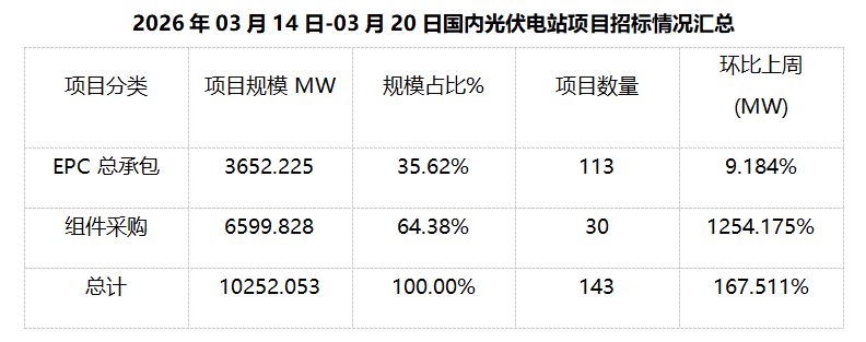 一、光伏項(xiàng)目招標(biāo)情況匯總: 根據(jù)Gessey蓋錫咨詢統(tǒng)計(jì),2026年03月14日-03月20日累計(jì)光伏招標(biāo)項(xiàng)目為143個,項(xiàng)目規(guī)模合計(jì)為10252.053MW。光伏組件采購招標(biāo)項(xiàng)目為30個,招標(biāo)規(guī)模為6599.828MW,環(huán)比上周1254.175%。EPC總承包招標(biāo)項(xiàng)目為113個,招標(biāo)規(guī)模為3652.225MW,環(huán)比上周9.184%。