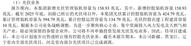 報告期內(nèi),本集團(tuán)新增光伏管理裝機(jī)容量為158.93兆瓦,其中,新增控股裝機(jī)容量158.93兆瓦。截至2025年底,扣除已轉(zhuǎn)讓的光伏項目外,本集團(tuán)光伏累計控股裝機(jī)容量為424.79兆瓦,累計管理裝機(jī)容量為594.79兆瓦,累計控股運營容量為134.79兆瓦,光伏控股在建工程建設(shè)容量10兆瓦。 根據(jù)集團(tuán)業(yè)務(wù)戰(zhàn)略調(diào)整,為進(jìn)一步聚焦核心主業(yè),集中資源投入風(fēng)力發(fā)電及天然氣相關(guān)產(chǎn)業(yè),除必須保留的參股企業(yè)外,公司將不再單獨投資發(fā)展光伏發(fā)電業(yè)務(wù)。因此,待項目建成后,本公司計劃逐步出售或轉(zhuǎn)讓現(xiàn)有控股光伏業(yè)務(wù)。截至本報告期末,本公司新疆、黑龍江、遼寧省內(nèi)全部光伏項目,河北省內(nèi)部分光伏項目已完成剝離。