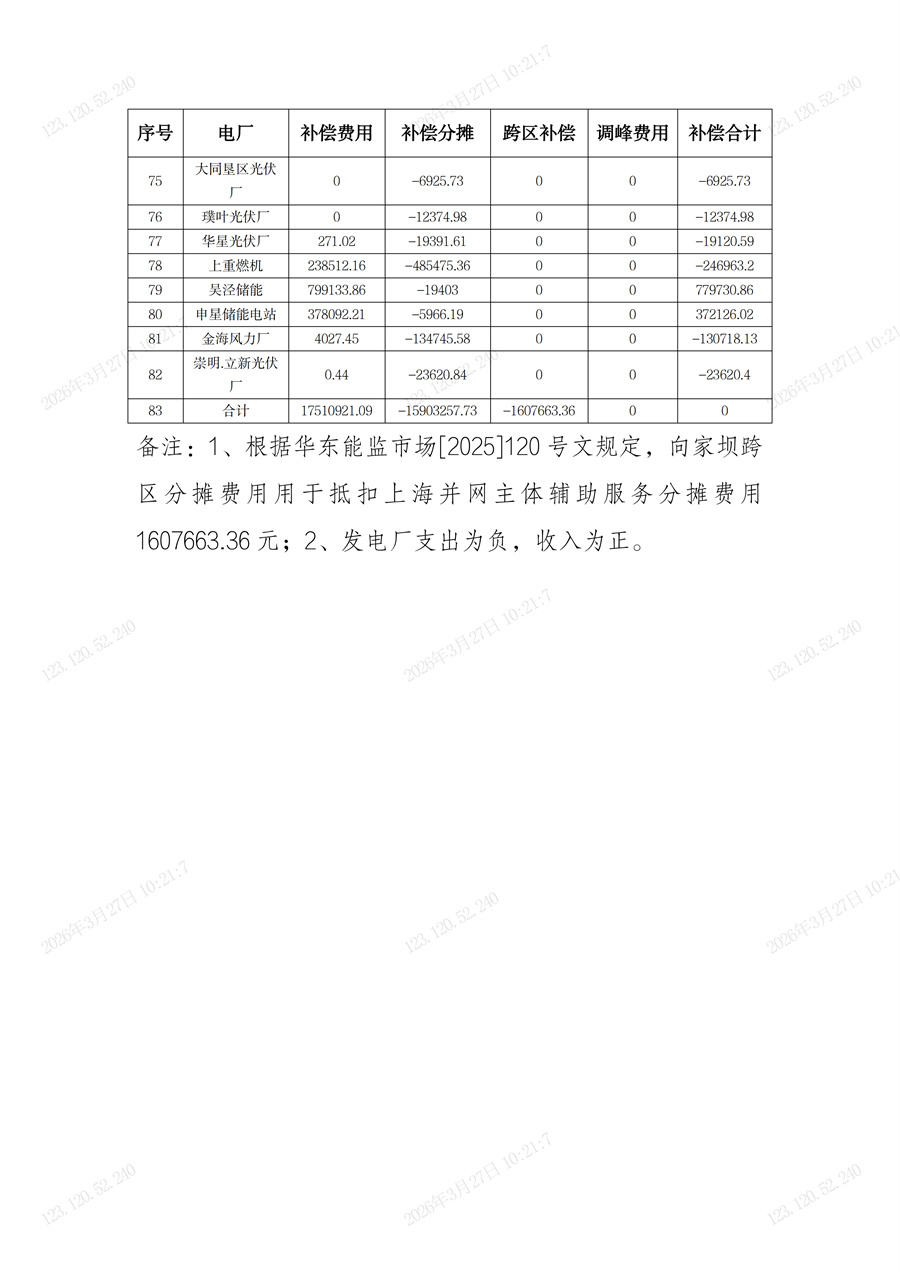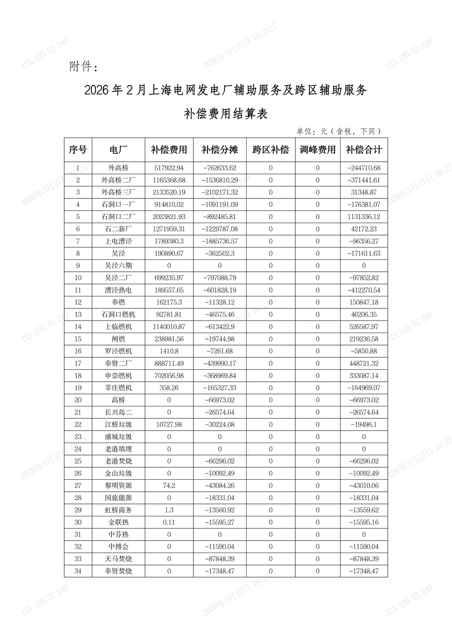 【重點提煉】上海電力交易中心3月25日公示2026年2月上海電網(wǎng) “兩個細則” 補償信息,含發(fā)電廠及跨區(qū)輔助服務補償結算表,異議反饋截止3月27日17:30。 根據(jù)《華東能源監(jiān)管局關于進一步明確發(fā)電機組調試運行期輔助服務分攤標準及“兩個細則”考核和補償結果公示、結算有關事項的通知》(華東監(jiān)能市場〔2023〕117號)、《華東能源監(jiān)管局關于印發(fā)<長三角電力輔助服務管理實施細則(結算試運行稿)>和<長三角電力并網(wǎng)運行管理實施細則(結算試運行稿)>的通知》等文件要求,國網(wǎng)上海市電力公司完成了2026年2月上海電網(wǎng)“兩個細則”補償信息的計算和匯總,具體信息詳見附件,現(xiàn)予以公示。如有不同意見,可于2026年3月27日17:30前向國網(wǎng)上海市電力公司反饋。 聯(lián)系電話:021-28926869 上海電力交易中心 2026年3月25日 2026年2月份上海電網(wǎng)發(fā)電廠輔助服務及跨區(qū)輔助服務補償費用結算表