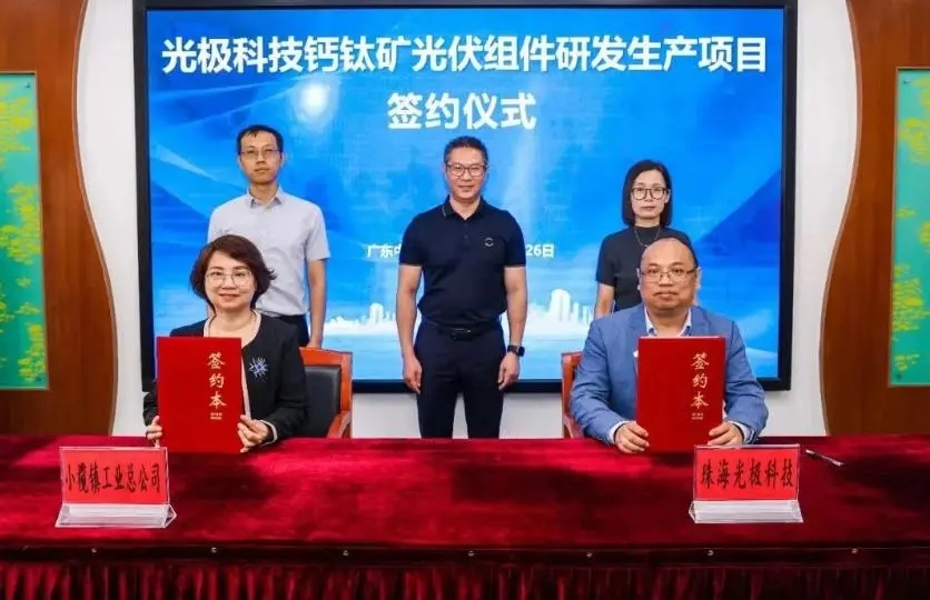 【合作速遞】3月26日,小欖鎮(zhèn)工業(yè)總公司與珠海光極科技簽約,合資建設(shè)鈣鈦礦異質(zhì)結(jié)光伏膠膜項(xiàng)目,總投資2000萬(wàn)元,預(yù)計(jì)年產(chǎn)值2500萬(wàn)元,加速鈣鈦礦核心材料產(chǎn)業(yè)化。 3月26日上午,小欖鎮(zhèn)工業(yè)總公司與珠海光極科技技術(shù)有限公司(以下簡(jiǎn)稱“珠海光極科技”)正式簽署光極科技鈣鈦礦異質(zhì)結(jié)研發(fā)生產(chǎn)項(xiàng)目,雙方將攜手打造光伏發(fā)電膠膜生產(chǎn)基地,推動(dòng)鈣鈦礦光伏異質(zhì)結(jié)核心技術(shù)產(chǎn)業(yè)化落地,為小欖新能源產(chǎn)業(yè)高質(zhì)量發(fā)展再添強(qiáng)勁動(dòng)力。