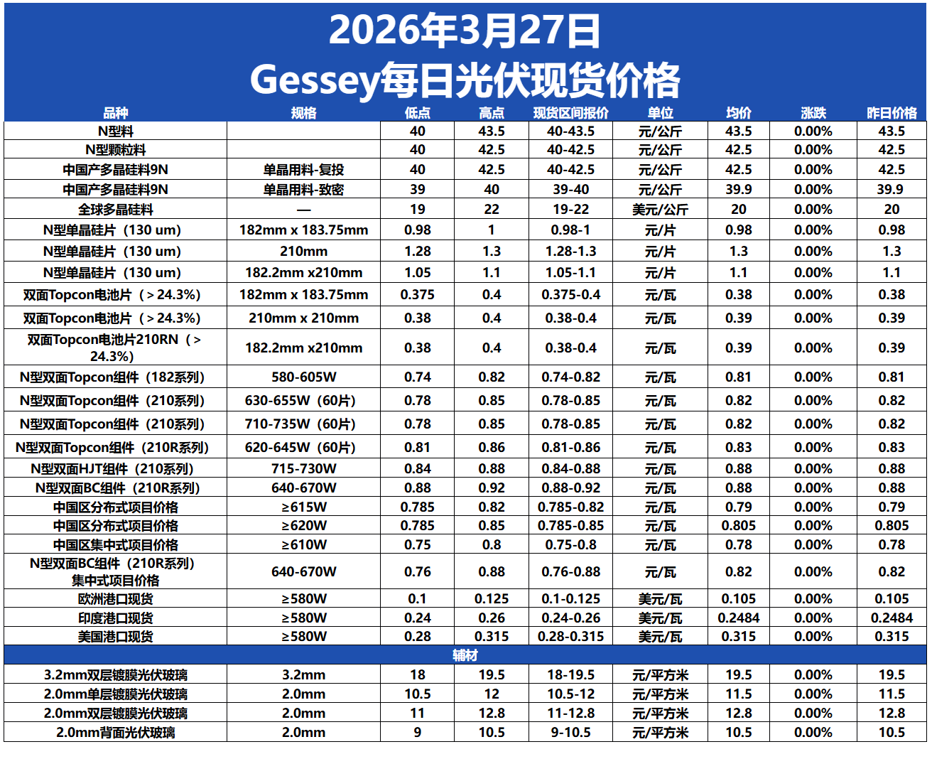 Gessey:3月27日每日光伏市場行情2026-03-27 18:14來源:gessey蓋錫咨詢瀏覽數(shù):247次