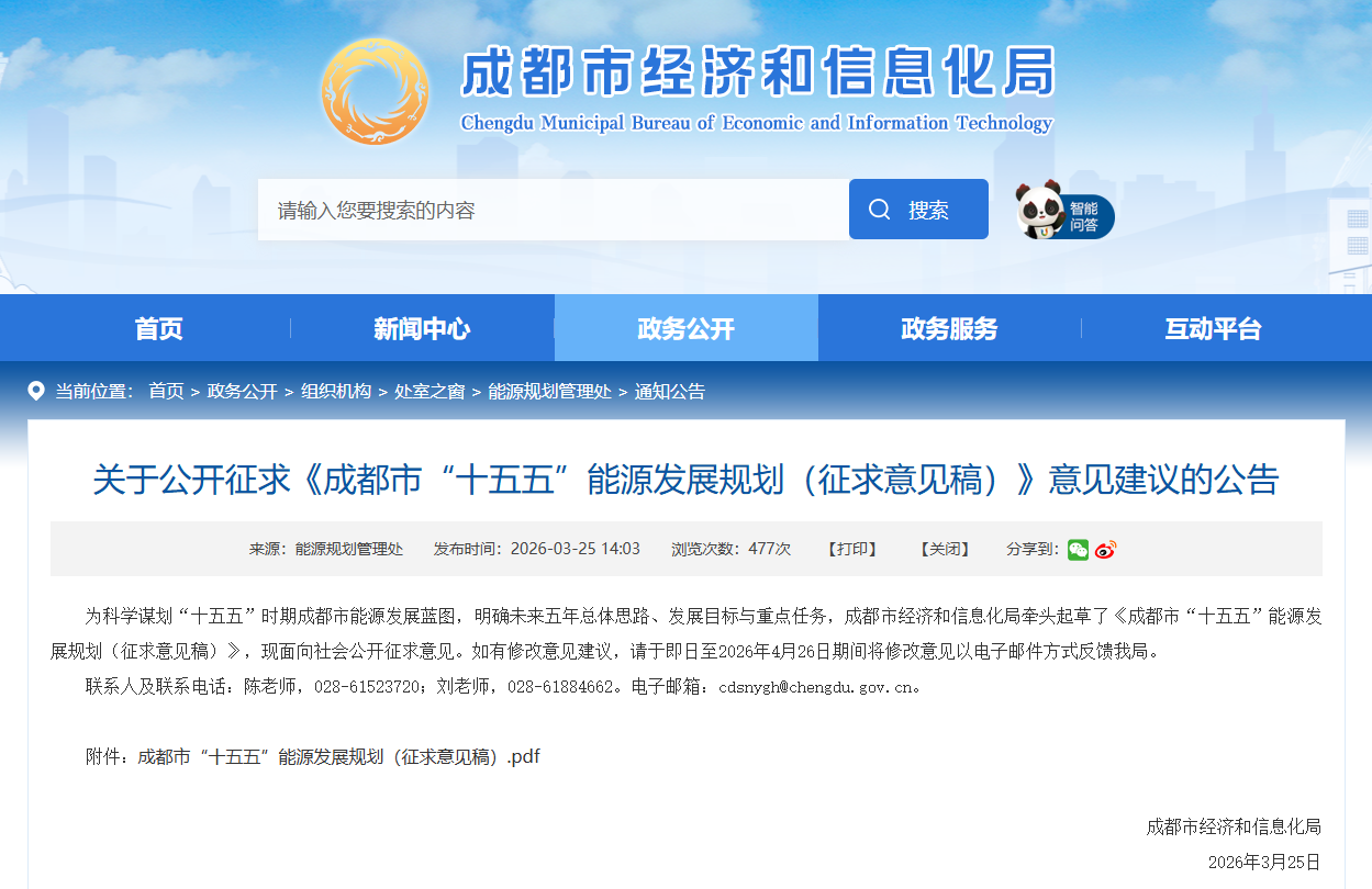 原文如下: 關(guān)于公開征求《成都市“十五五”能源發(fā)展規(guī)劃(征求意見稿)》意見建議的公告 為科學(xué)謀劃“十五五”時期成都市能源發(fā)展藍圖,明確未來五年總體思路、發(fā)展目標與重點任務(wù),成都市經(jīng)濟和信息化局牽頭起草了《成都市“十五五”能源發(fā)展規(guī)劃(征求意見稿)》,現(xiàn)面向社會公開征求意見。如有修改意見建議,請于即日至2026年4月26日期間將修改意見以電子郵件方式反饋我局。 聯(lián)系人及聯(lián)系電話:陳老師,028-61523720;劉老師,028-61884662。電子郵箱:cdsnygh@chengdu.gov.cn。 附件: 成都市經(jīng)濟和信息化局 2026年3月25日