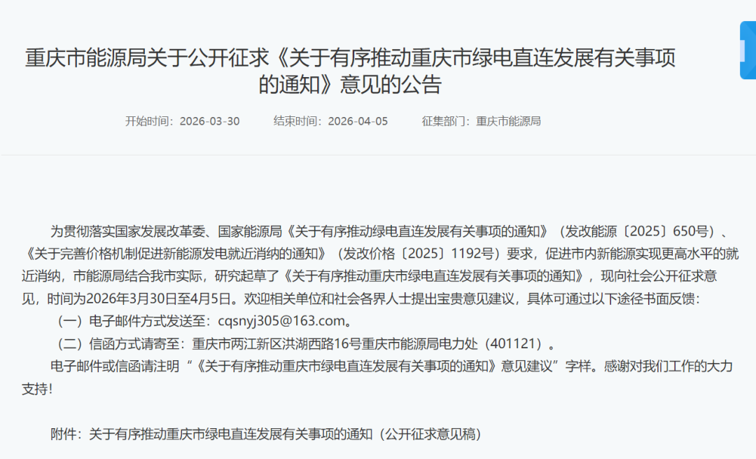 自發(fā)自用不低于60%,重慶明確綠電直連電量比例硬指標(biāo)關(guān)于有序推動(dòng)重慶市綠電直連發(fā)展有關(guān)事項(xiàng)的通知 (公開(kāi)征求意見(jiàn)稿)2026-03-31 15:35來(lái)源:gessey蓋錫咨詢(xún)瀏覽數(shù):241次