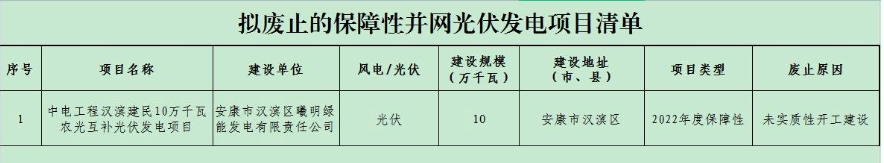 【政策重點提煉】3月30日,陜西省安康市發(fā)展和改革委員會公示擬廢止保障性光伏發(fā)電項目有關(guān)情況。根據(jù)公示,擬廢止的項目為中電工程漢濱建民10萬千瓦農(nóng)光互補光伏發(fā)電項目,建設(shè)規(guī)模10萬千瓦,建設(shè)單位為安康市漢濱區(qū)曦明綠能發(fā)電有限責(zé)任公司。項目建設(shè)地址位于安康市漢濱區(qū),為2022年度保障性項目,廢止原因為未實質(zhì)性開工建設(shè)。 原文如下: 關(guān)于擬廢止保障性光伏發(fā)電項目有關(guān)情況的公示 根據(jù)陜西省發(fā)展改革委《關(guān)于調(diào)整2022-2024年度保障性并網(wǎng)新能源項目核準(備案)和并網(wǎng)時限的通知》(陜發(fā)改能新能源〔2025〕1431號)相關(guān)要求,經(jīng)漢濱區(qū)正式申報,現(xiàn)對擬廢止的中電工程漢濱建民10萬千瓦農(nóng)光互補光伏發(fā)電項目有關(guān)情況予以公示。公示自發(fā)布之日起5個工作日(2026年3月30日至2026年4月3日)。如有意見和建議,請在公示期間向安康市發(fā)展和改革委員會反映,反映以來人或署名來信(包括電子信函)等方式,對匿名方式提出異議的不予受理。 聯(lián)系電話:0915-3203690,傳真:0915-3212285 通訊地址:漢濱區(qū)育才路113號,電子郵箱:aksfgwnyk@163.com。