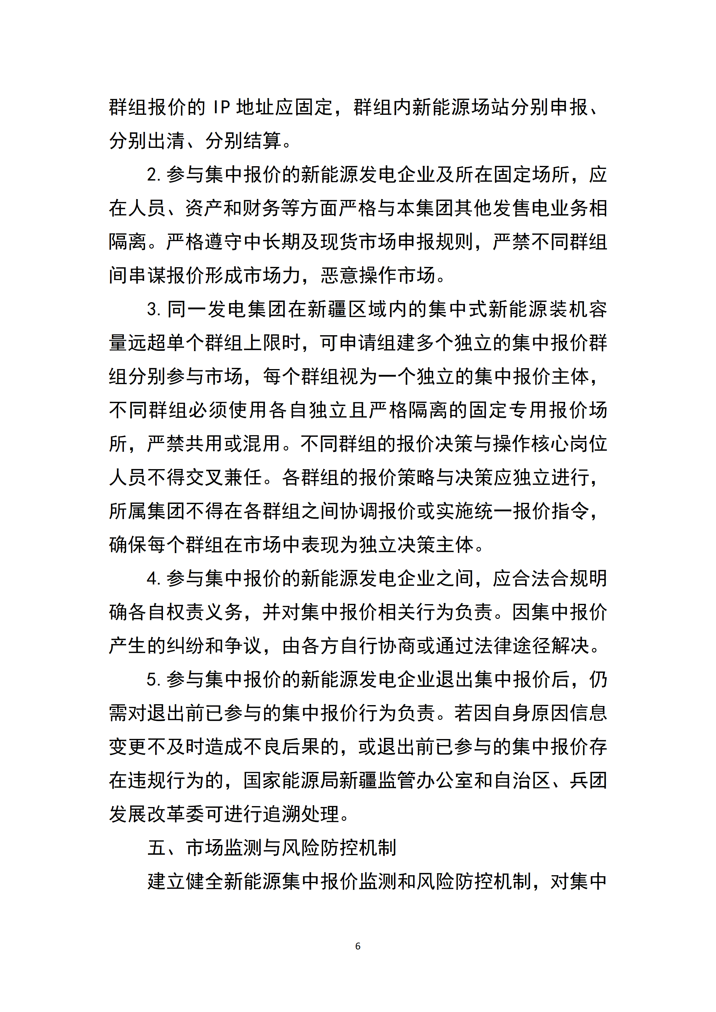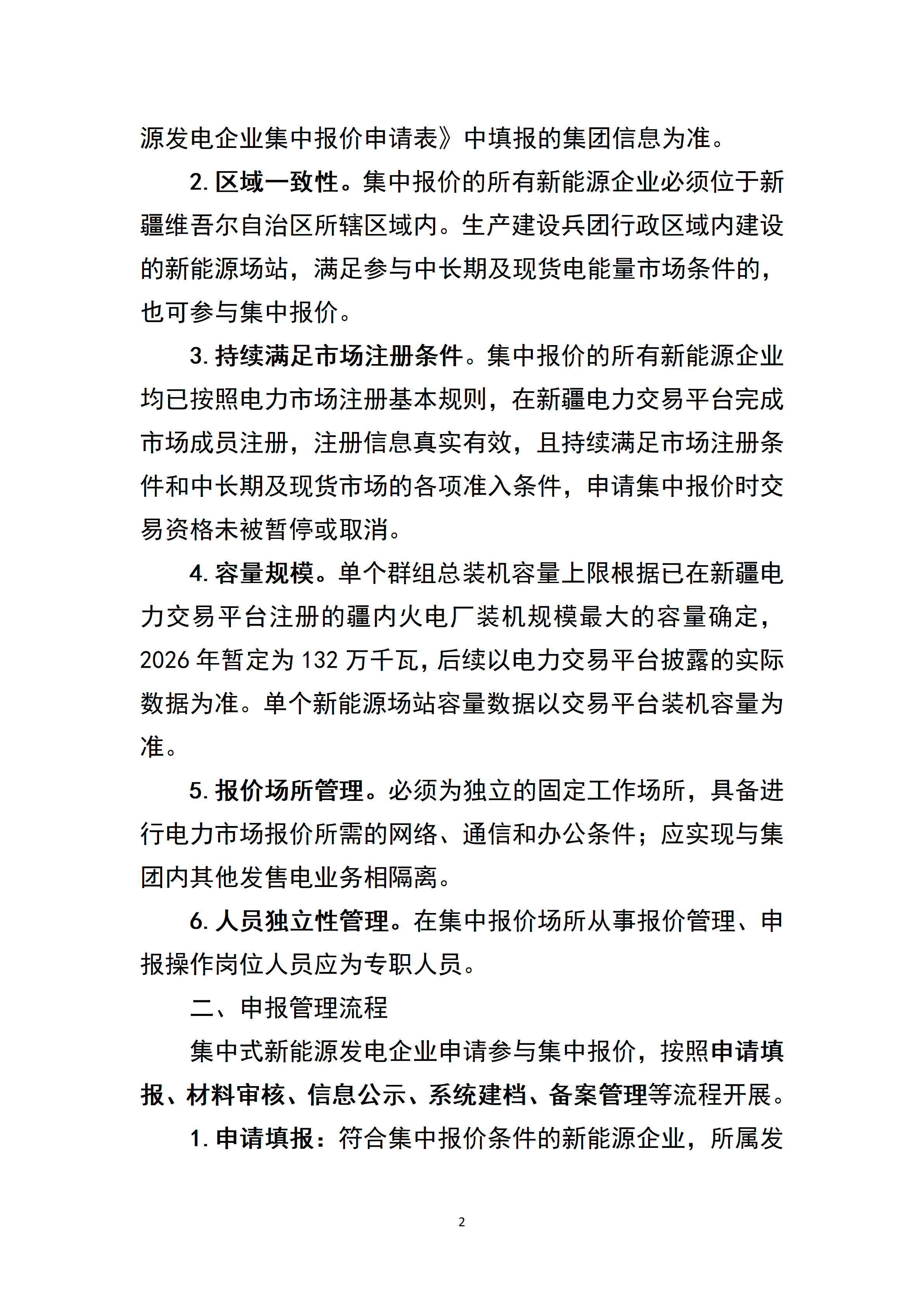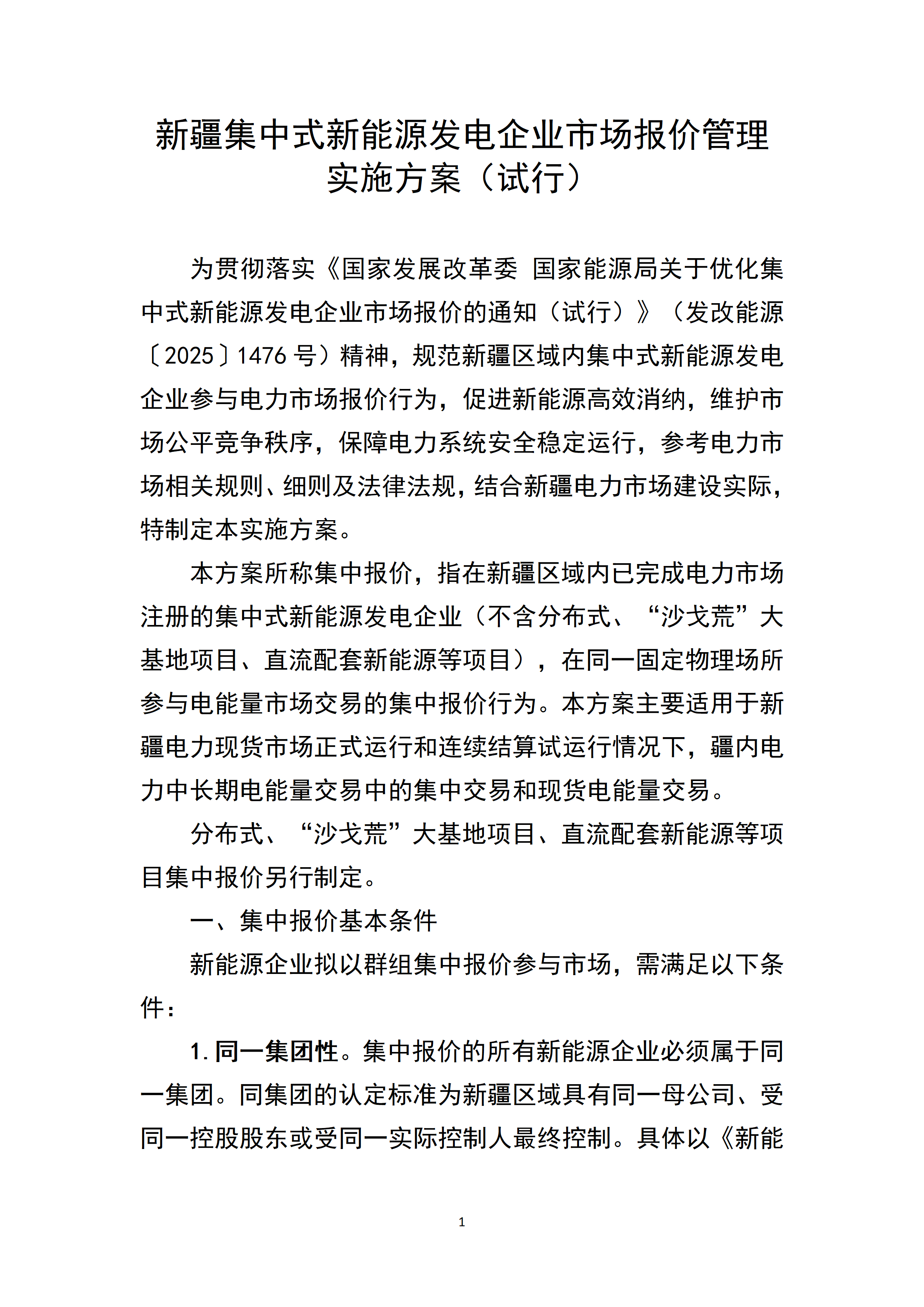 【政策重點(diǎn)提煉】3月30日,新疆能源監(jiān)管辦印發(fā)《新疆集中式新能源發(fā)電企業(yè)市場報(bào)價(jià)管理實(shí)施方案 (試行)》,4月1日起實(shí)施。方案允許符合條件的同一集團(tuán)、疆內(nèi)集中式新能源場站以群組集中報(bào)價(jià)參與中長期與現(xiàn)貨交易,單個(gè)群組裝機(jī)上限132萬千瓦,并對場所、人員、注冊資質(zhì)等設(shè)嚴(yán)格準(zhǔn)入,旨在規(guī)范市場、適配現(xiàn)貨運(yùn)行。 3月30日,新疆能源監(jiān)管辦發(fā)布關(guān)于印發(fā)《新疆集中式新能源發(fā)電企業(yè)市場報(bào)價(jià)管理實(shí)施方案(試行)》的通知,自2026年4月1日起實(shí)施。 本方案所稱集中報(bào)價(jià),指在新疆區(qū)域內(nèi)已完成電力市場注冊的集中式新能源發(fā)電企業(yè)(不含分布式、“沙戈荒”大基地項(xiàng)目、直流配套新能源等項(xiàng)目),在同一固定物理場所參與電能量市場交易的集中報(bào)價(jià)行為。本方案主要適用于新疆電力現(xiàn)貨市場正式運(yùn)行和連續(xù)結(jié)算試運(yùn)行情況下,疆內(nèi)電力中長期電能量交易中的集中交易和現(xiàn)貨電能量交易。分布式、“沙戈荒”大基地項(xiàng)目、直流配套新能源等項(xiàng)目集中報(bào)價(jià)另行制定。 新能源企業(yè)擬以群組集中報(bào)價(jià)參與市場,需滿足以下條件: 1.同一集團(tuán)性。集中報(bào)價(jià)的所有新能源企業(yè)必須屬于同一集團(tuán)。同集團(tuán)的認(rèn)定標(biāo)準(zhǔn)為新疆區(qū)域具有同一母公司、受同一控股股東或受同一實(shí)際控制人最終控制。具體以《新能源發(fā)電企業(yè)集中報(bào)價(jià)申請表》中填報(bào)的集團(tuán)信息為準(zhǔn)。 2.區(qū)域一致性。集中報(bào)價(jià)的所有新能源企業(yè)必須位于新疆維吾爾自治區(qū)所轄區(qū)域內(nèi)。生產(chǎn)建設(shè)兵團(tuán)行政區(qū)域內(nèi)建設(shè)的新能源場站,滿足參與中長期及現(xiàn)貨電能量市場條件的,也可參與集中報(bào)價(jià)。 3.持續(xù)滿足市場注冊條件。集中報(bào)價(jià)的所有新能源企業(yè)均已按照電力市場注冊基本規(guī)則,在新疆電力交易平臺完成市場成員注冊,注冊信息真實(shí)有效,且持續(xù)滿足市場注冊條件和中長期及現(xiàn)貨市場的各項(xiàng)準(zhǔn)入條件,申請集中報(bào)價(jià)時(shí)交易資格未被暫停或取消。 4.容量規(guī)模。單個(gè)群組總裝機(jī)容量上限根據(jù)已在新疆電力交易平臺注冊的疆內(nèi)火電廠裝機(jī)規(guī)模最大的容量確定,2026年暫定為132萬千瓦,后續(xù)以電力交易平臺披露的實(shí)際數(shù)據(jù)為準(zhǔn)。單個(gè)新能源場站容量數(shù)據(jù)以交易平臺裝機(jī)容量為準(zhǔn)。 5.報(bào)價(jià)場所管理。必須為獨(dú)立的固定工作場所,具備進(jìn)行電力市場報(bào)價(jià)所需的網(wǎng)絡(luò)、通信和辦公條件;應(yīng)實(shí)現(xiàn)與集團(tuán)內(nèi)其他發(fā)售電業(yè)務(wù)相隔離。 6.人員獨(dú)立性管理。在集中報(bào)價(jià)場所從事報(bào)價(jià)管理、申報(bào)操作崗位人員應(yīng)為專職人員。 詳情如下: