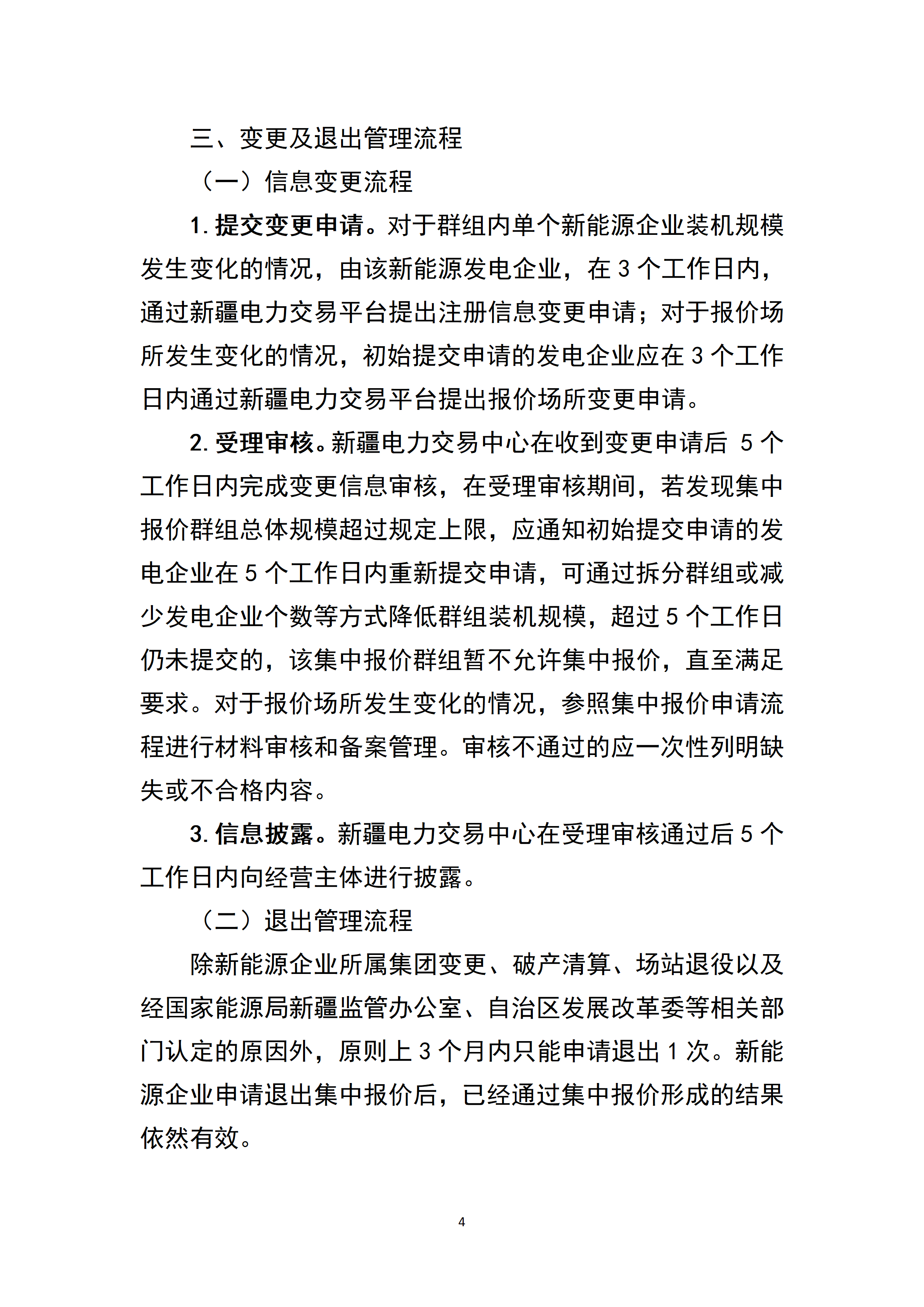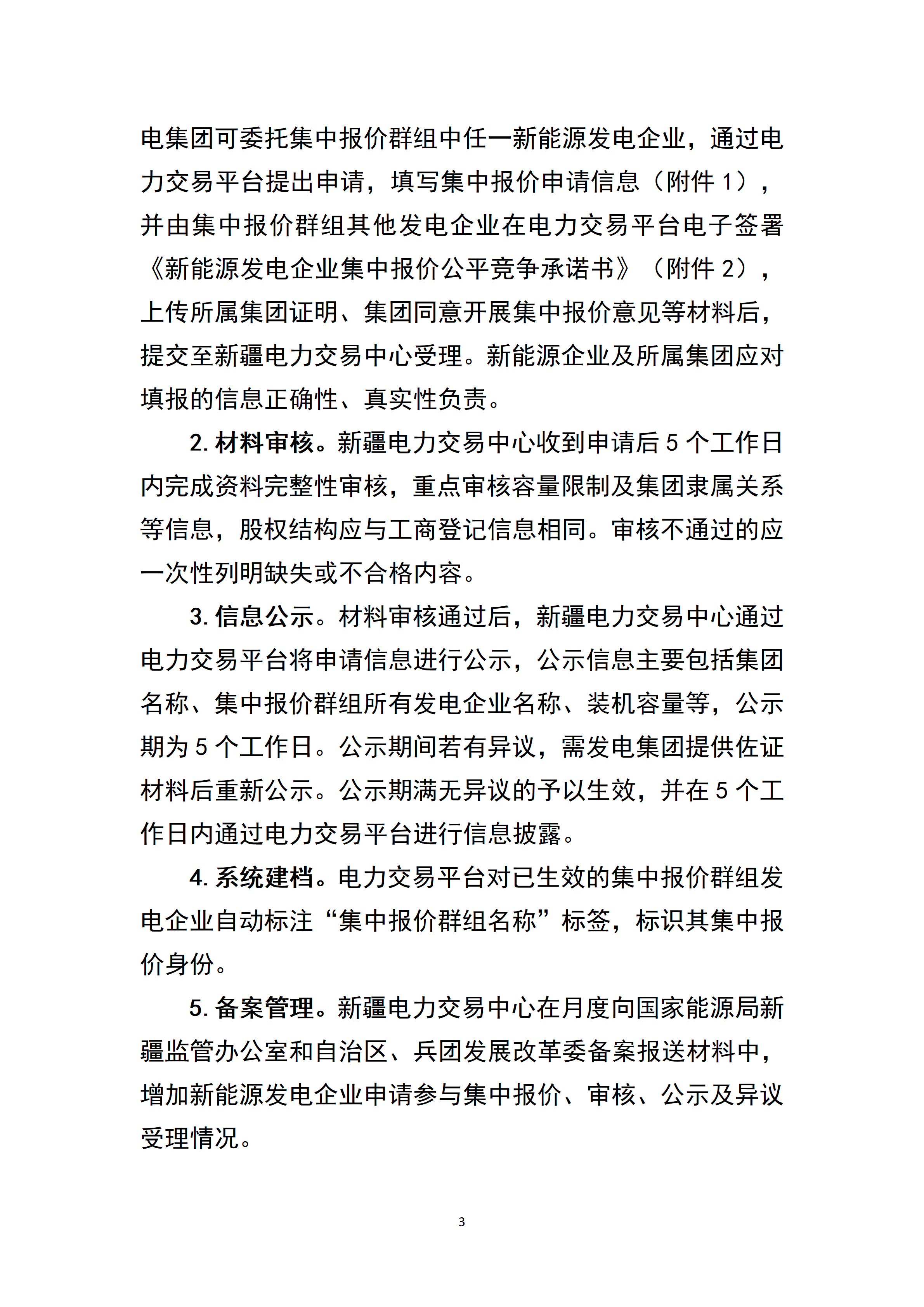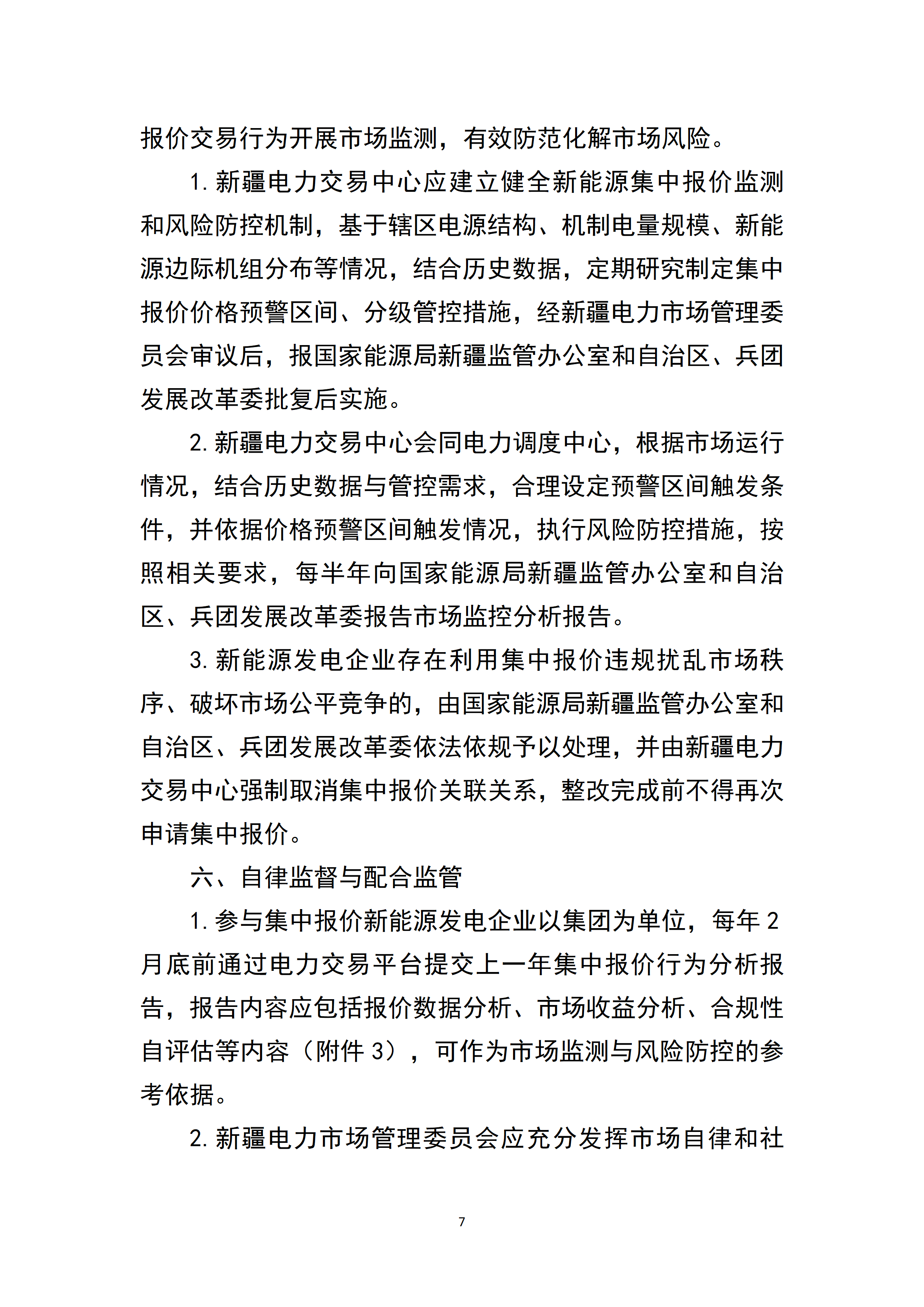 【政策重點(diǎn)提煉】3月30日,新疆能源監(jiān)管辦印發(fā)《新疆集中式新能源發(fā)電企業(yè)市場報(bào)價(jià)管理實(shí)施方案 (試行)》,4月1日起實(shí)施。方案允許符合條件的同一集團(tuán)、疆內(nèi)集中式新能源場站以群組集中報(bào)價(jià)參與中長期與現(xiàn)貨交易,單個(gè)群組裝機(jī)上限132萬千瓦,并對場所、人員、注冊資質(zhì)等設(shè)嚴(yán)格準(zhǔn)入,旨在規(guī)范市場、適配現(xiàn)貨運(yùn)行。 3月30日,新疆能源監(jiān)管辦發(fā)布關(guān)于印發(fā)《新疆集中式新能源發(fā)電企業(yè)市場報(bào)價(jià)管理實(shí)施方案(試行)》的通知,自2026年4月1日起實(shí)施。 本方案所稱集中報(bào)價(jià),指在新疆區(qū)域內(nèi)已完成電力市場注冊的集中式新能源發(fā)電企業(yè)(不含分布式、“沙戈荒”大基地項(xiàng)目、直流配套新能源等項(xiàng)目),在同一固定物理場所參與電能量市場交易的集中報(bào)價(jià)行為。本方案主要適用于新疆電力現(xiàn)貨市場正式運(yùn)行和連續(xù)結(jié)算試運(yùn)行情況下,疆內(nèi)電力中長期電能量交易中的集中交易和現(xiàn)貨電能量交易。分布式、“沙戈荒”大基地項(xiàng)目、直流配套新能源等項(xiàng)目集中報(bào)價(jià)另行制定。 新能源企業(yè)擬以群組集中報(bào)價(jià)參與市場,需滿足以下條件: 1.同一集團(tuán)性。集中報(bào)價(jià)的所有新能源企業(yè)必須屬于同一集團(tuán)。同集團(tuán)的認(rèn)定標(biāo)準(zhǔn)為新疆區(qū)域具有同一母公司、受同一控股股東或受同一實(shí)際控制人最終控制。具體以《新能源發(fā)電企業(yè)集中報(bào)價(jià)申請表》中填報(bào)的集團(tuán)信息為準(zhǔn)。 2.區(qū)域一致性。集中報(bào)價(jià)的所有新能源企業(yè)必須位于新疆維吾爾自治區(qū)所轄區(qū)域內(nèi)。生產(chǎn)建設(shè)兵團(tuán)行政區(qū)域內(nèi)建設(shè)的新能源場站,滿足參與中長期及現(xiàn)貨電能量市場條件的,也可參與集中報(bào)價(jià)。 3.持續(xù)滿足市場注冊條件。集中報(bào)價(jià)的所有新能源企業(yè)均已按照電力市場注冊基本規(guī)則,在新疆電力交易平臺完成市場成員注冊,注冊信息真實(shí)有效,且持續(xù)滿足市場注冊條件和中長期及現(xiàn)貨市場的各項(xiàng)準(zhǔn)入條件,申請集中報(bào)價(jià)時(shí)交易資格未被暫停或取消。 4.容量規(guī)模。單個(gè)群組總裝機(jī)容量上限根據(jù)已在新疆電力交易平臺注冊的疆內(nèi)火電廠裝機(jī)規(guī)模最大的容量確定,2026年暫定為132萬千瓦,后續(xù)以電力交易平臺披露的實(shí)際數(shù)據(jù)為準(zhǔn)。單個(gè)新能源場站容量數(shù)據(jù)以交易平臺裝機(jī)容量為準(zhǔn)。 5.報(bào)價(jià)場所管理。必須為獨(dú)立的固定工作場所,具備進(jìn)行電力市場報(bào)價(jià)所需的網(wǎng)絡(luò)、通信和辦公條件;應(yīng)實(shí)現(xiàn)與集團(tuán)內(nèi)其他發(fā)售電業(yè)務(wù)相隔離。 6.人員獨(dú)立性管理。在集中報(bào)價(jià)場所從事報(bào)價(jià)管理、申報(bào)操作崗位人員應(yīng)為專職人員。 詳情如下: