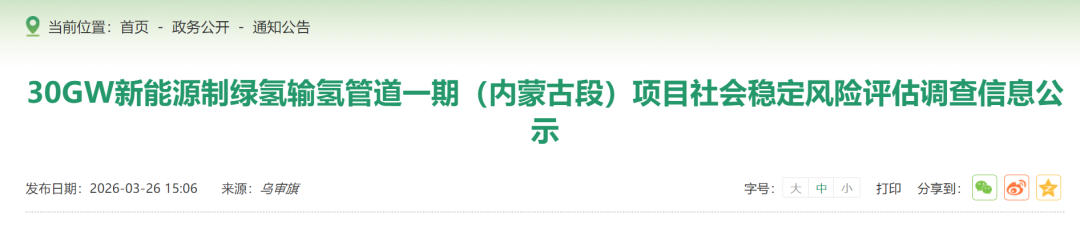 3月26日,烏審旗政府網(wǎng)站發(fā)布了《30GW新能源制綠氫輸氫管道一期(內(nèi)蒙古段)項(xiàng)目社會(huì)穩(wěn)定風(fēng)險(xiǎn)評(píng)估調(diào)查信息公示》。