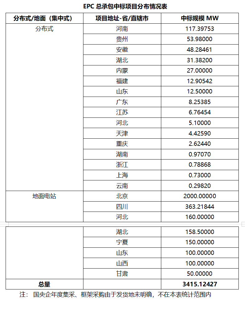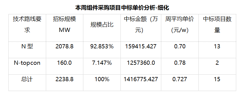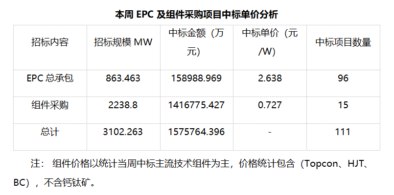 三、EPC總承包及組件采購(gòu)情況匯總 本周光伏EPC總承包中標(biāo)規(guī)模達(dá)863.463MW,總中標(biāo)金額158988.969萬(wàn)元,平均中標(biāo)單價(jià)為2.638元/W,中標(biāo)數(shù)量96個(gè)。 本周光伏組件采購(gòu)中標(biāo)規(guī)模達(dá)2238.8MW,總中標(biāo)金額1416775.427萬(wàn)元,平均中標(biāo)單價(jià)0.727元/W,中標(biāo)數(shù)量15個(gè)。
