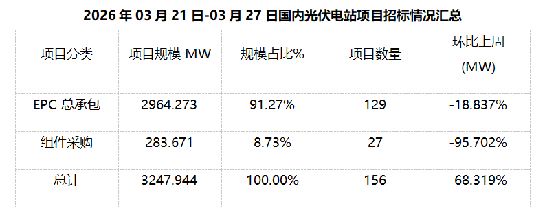 一、光伏項(xiàng)目招標(biāo)情況匯總: 根據(jù)Gessey蓋錫咨詢統(tǒng)計(jì),2026年03月21日-03月27日累計(jì)光伏招標(biāo)項(xiàng)目為156個(gè),項(xiàng)目規(guī)模合計(jì)為3247.944MW。光伏組件采購(gòu)招標(biāo)項(xiàng)目為27個(gè),招標(biāo)規(guī)模為283.671MW,環(huán)比上周-95.702%。EPC總承包招標(biāo)項(xiàng)目為129個(gè),招標(biāo)規(guī)模為2964.273MW,環(huán)比上周-18.837%。