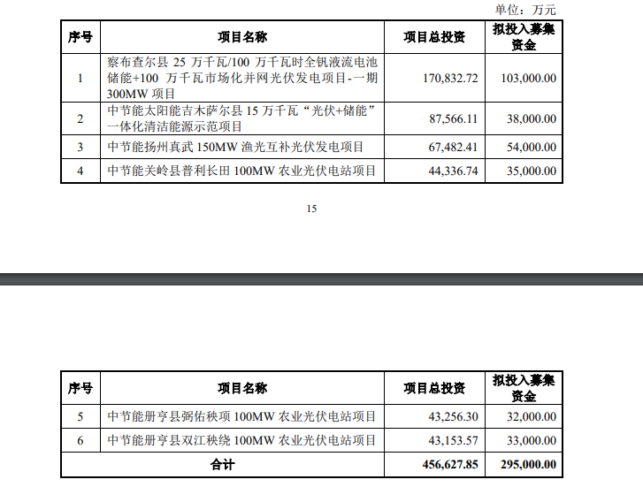 【核心數(shù)據(jù)提煉】4月3日,中節(jié)能太陽(yáng)能披露可轉(zhuǎn)債受托管理報(bào)告,公司擬募資29.5億元投入6個(gè)光伏及儲(chǔ)能項(xiàng)目,項(xiàng)目總投資合計(jì)45.66億元。其中新疆察布查爾250MW/1000MWh全釩液流儲(chǔ)能+300MW光伏為最大單體項(xiàng)目,其余涵蓋光伏+儲(chǔ)能、漁光互補(bǔ)、農(nóng)光互補(bǔ)等類型,本次募資將進(jìn)一步擴(kuò)大公司光儲(chǔ)業(yè)務(wù)規(guī)模,強(qiáng)化清潔能源市場(chǎng)競(jìng)爭(zhēng)力。 4月3日,中節(jié)能太陽(yáng)能股份有限公司(簡(jiǎn)稱“太陽(yáng)能”)發(fā)布向不特定對(duì)象發(fā)行可轉(zhuǎn)換公司債券第一次臨時(shí)受托管理事務(wù)報(bào)告。 報(bào)告披露,公司擬募集資金合計(jì)29.5億元,投向6個(gè)光伏及儲(chǔ)能相關(guān)項(xiàng)目,項(xiàng)目總投資合計(jì)45.66億元。 其中,察布查爾縣25萬(wàn)千瓦/100萬(wàn)千瓦時(shí)全釩液流電池儲(chǔ)能+100萬(wàn)千瓦市場(chǎng)化并網(wǎng)光伏發(fā)電項(xiàng)目(一期300MW) 總投資17.08億元,擬投入募集資金10.3億元。該項(xiàng)目包含250MW/1000MWh全釩液流電池儲(chǔ)能系統(tǒng),為本次募投中最大的儲(chǔ)能配套項(xiàng)目。 其余5個(gè)項(xiàng)目分別為: 中節(jié)能太陽(yáng)能吉木薩爾縣15萬(wàn)千瓦“光伏+儲(chǔ)能”一體化清潔能源示范項(xiàng)目,總投資8.76億元,擬投入募集資金3.8億元; 中節(jié)能揚(yáng)州真武150MW漁光互補(bǔ)光伏發(fā)電項(xiàng)目,總投資6.75億元,擬投入募集資金5.4億元; 中節(jié)能關(guān)嶺縣普利長(zhǎng)田100MW農(nóng)業(yè)光伏電站項(xiàng)目,總投資4.43億元,擬投入募集資金3.5億元; 中節(jié)能冊(cè)亨縣弼佑秧項(xiàng)100MW農(nóng)業(yè)光伏電站項(xiàng)目,總投資4.33億元,擬投入募集資金3.2億元; 中節(jié)能冊(cè)亨縣雙江秧繞100MW農(nóng)業(yè)光伏電站項(xiàng)目,總投資4.32億元,擬投入募集資金3.3億元。