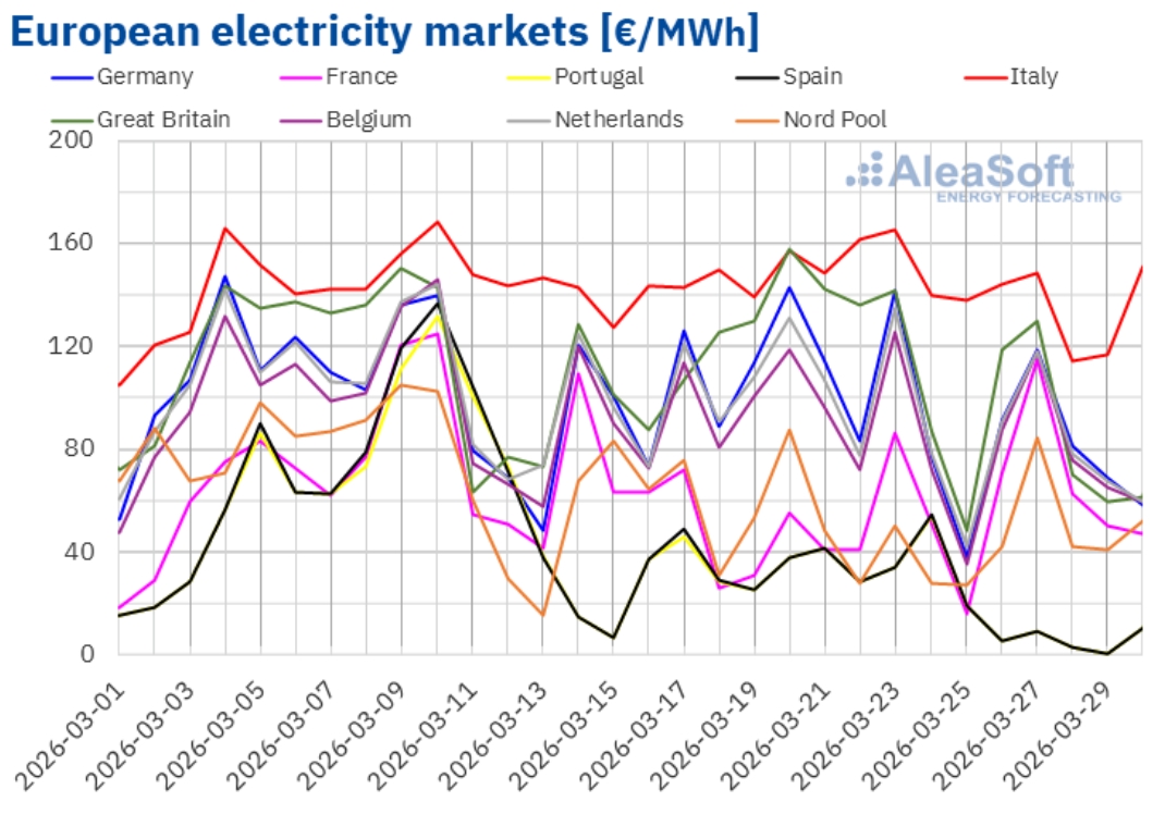 根據(jù)AleaSoft Energy Forecasting最新分析,上周歐洲多數(shù)主要電力市場(chǎng)的周均電價(jià)出現(xiàn)下跌。 AleaSoft表示,上周初,歐洲大多數(shù)主要市場(chǎng)的日度電價(jià)仍處于較高水平,但隨著一周內(nèi)天然氣價(jià)格回落,日度電價(jià)也逐步走低。 太陽能和風(fēng)能發(fā)電增加也在部分市場(chǎng)推動(dòng)了電價(jià)下行,而另一些市場(chǎng)則受到用電需求下降的影響。 在始于3月23日的這一周內(nèi),比利時(shí)、荷蘭、法國、德國、北歐、葡萄牙和西班牙市場(chǎng)的平均電價(jià)均低于90歐元/兆瓦時(shí)(103.18美元/兆瓦時(shí))。除法國市場(chǎng)外,所有市場(chǎng)的均價(jià)均較前一周下滑。 其中,葡萄牙和西班牙的均價(jià)最低,分別為17.69歐元/兆瓦時(shí)和17.78歐元/兆瓦時(shí),其次是北歐市場(chǎng),為45.10歐元/兆瓦時(shí)。英國和意大利市場(chǎng)的均價(jià)則高于90歐元/兆瓦時(shí),分別達(dá)到93.54歐元/兆瓦時(shí)和138.15歐元/兆瓦時(shí)。 意大利市場(chǎng)上周從周一到周五的日度電價(jià)始終高于110歐元/兆瓦時(shí),而德國、比利時(shí)、英國、法國和荷蘭市場(chǎng)也至少有一天的電價(jià)超過110歐元/兆瓦時(shí)。 另一方面,在所分析的市場(chǎng)中,西班牙和葡萄牙市場(chǎng)錄得當(dāng)周最低的日均電價(jià),3月29日兩地均降至0.18歐元/兆瓦時(shí)。這一價(jià)格是葡萄牙市場(chǎng)自2024年4月6日以來的最低水平,也是西班牙市場(chǎng)自2013年4月2日以來的最低水平。 上周,意大利、葡萄牙和西班牙的太陽能發(fā)電量環(huán)比增加,而法國和德國則出現(xiàn)下降。AleaSoft預(yù)計(jì),本周意大利和西班牙的太陽能發(fā)電仍將延續(xù)增長趨勢(shì),但德國將進(jìn)一步下滑。 意大利和西班牙還創(chuàng)下3月份單日太陽能發(fā)電量的歷史新高。西班牙于3月24日達(dá)到194吉瓦時(shí),意大利則在一天后的3月25日錄得139吉瓦時(shí)。 TTF天然氣期貨價(jià)格在周初達(dá)到當(dāng)周最高結(jié)算價(jià)56.68歐元/兆瓦時(shí)。AleaSoft稱,美國總統(tǒng)特朗普就與伊朗和平談判發(fā)表的表態(tài),推動(dòng)天然氣期貨價(jià)格下行,并于3月25日跌至當(dāng)周最低結(jié)算價(jià)52.82歐元/兆瓦時(shí)。 AleaSoft補(bǔ)充稱,沖突局勢(shì)的發(fā)展以及歐洲儲(chǔ)氣水平偏低,支撐了周后段價(jià)格反彈。3月27日,結(jié)算價(jià)回升至54.18歐元/兆瓦時(shí),但仍較前一個(gè)周五低8.6%。 AleaSoft在最新更新中還預(yù)測(cè),4月第一周部分市場(chǎng)的電價(jià)可能繼續(xù)下降,但強(qiáng)調(diào)“天然氣價(jià)格走勢(shì)仍將持續(xù)主導(dǎo)歐洲電力市場(chǎng)價(jià)格”。