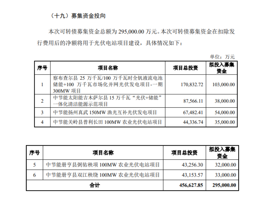 【核心數(shù)據(jù)提煉】4月3日,中節(jié)能太陽能披露太能轉(zhuǎn)債受托管理報告,公司發(fā)行可轉(zhuǎn)債募資29.5億元,凈額29.47億元已全額到賬并專戶監(jiān)管。資金全部投向6個光伏及儲能項目,總投資45.66億元,涵蓋全釩液流儲能配套、漁光/農(nóng)光互補等模式,其中新疆一單體項目獲投10.3億元,助力公司光儲業(yè)務(wù)規(guī)模化擴張。 4月3日,中節(jié)能太陽能披露太能轉(zhuǎn)債第一次臨時受托管理事務(wù)報告稱,公司通過向不特定對象發(fā)行可轉(zhuǎn)換公司債券,募集資金29.5億元,專項用于光伏電站及配套儲能項目建設(shè),進一步加碼新能源業(yè)務(wù)規(guī)?;l(fā)展。 根據(jù)公告,本次可轉(zhuǎn)債發(fā)行2950萬張,每張面值100元,募集資金凈額29.47億元,資金已于2025年4月3日全部到位并納入專戶監(jiān)管。債券期限6年,票面利率逐年遞增,初始轉(zhuǎn)股價格為5.67元/股,轉(zhuǎn)股期自2025年10月9日起至2031年3月27日止。 募集資金將全部投向6個光伏及儲能項目,項目總投資達45.66億元。