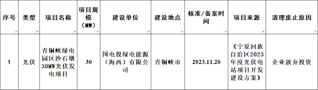 【政策重點提煉】4月7日,吳忠市發(fā)展和改革委員會發(fā)布關(guān)于吳忠市清理廢止不具備建設(shè)條件新能源項目的公示,根據(jù)公示,經(jīng)青銅峽市發(fā)展和改革局申請,青銅峽綠電園區(qū)沙石墩30MW光伏發(fā)電項目因企業(yè)放棄建設(shè)。項目規(guī)模為30MW,建設(shè)單位為國電投綠電能源(海西)有限公司,核準(zhǔn)/備案時間為2023年11月20日,項目來源為《寧夏回族自治區(qū)2023年度光伏電站項目開發(fā)建設(shè)方案》。 原文如下: 吳忠市發(fā)展和改革委員會關(guān)于吳忠市清理廢止不具備建設(shè)條件新能源項目的公示 按照自治區(qū)發(fā)展改革委《關(guān)于清理廢止不具備建設(shè)條件新能源項目的通知》(寧發(fā)改能源<發(fā)展>〔2025〕173號)要求,經(jīng)青銅峽市發(fā)展和改革局申請,青銅峽綠電園區(qū)沙石墩30MW光伏發(fā)電項目因企業(yè)放棄建設(shè),現(xiàn)予以清理廢止并進(jìn)行公示。公示期3個工作日,自2026年4月7日起至4月9日18:00止。如有異議,請將意見以書面形式送至我委能源科。聯(lián)系方式:0953-2039808。 附件:吳忠市清理廢止不具備建設(shè)條件新能源項目清單 吳忠市發(fā)展和改革委員會 2026年4月7日