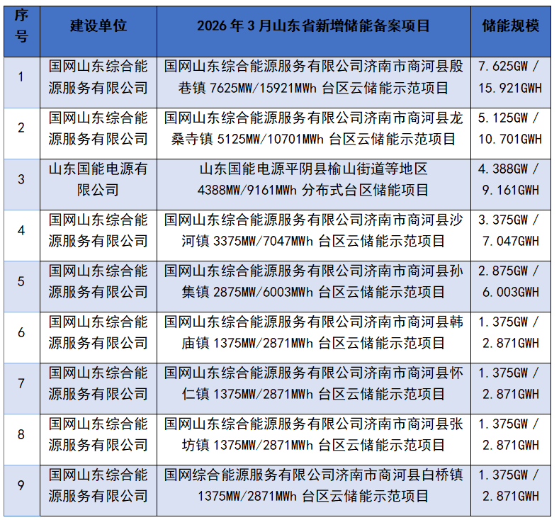 山東省3月以50.62GW/114.46GWh的備案規(guī)模穩(wěn)居全國第一,占全國總量的49.44%(GW)/42.48%(GWh)。 表1:2026年3月山東省新增儲能備案項目