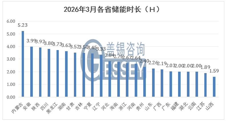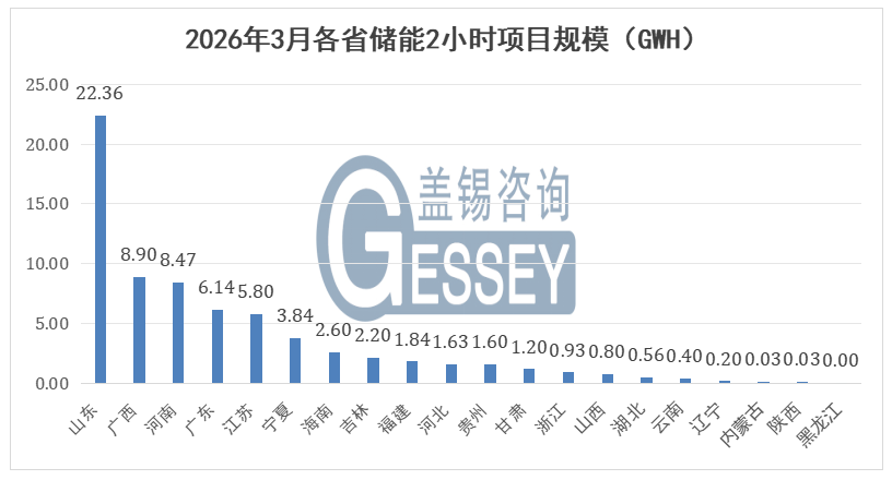 從平均儲能時長來看,一季度整體平均時長為2.64小時,其中1月平均時長2.83小時,2月平均時長2.62小時,3月平均時長2.58小時,呈現(xiàn)小幅回落趨勢。這反映出隨著備案規(guī)??焖贁U(kuò)張,短時儲能項目占比有所提升。 二、區(qū)域格局分析2.1省份分布:山東領(lǐng)跑,頭部集中明顯 從省份分布來看,2026年3月儲能備案呈現(xiàn)明顯的區(qū)域集中特征。備案規(guī)模TOP10省份數(shù)據(jù)如下: