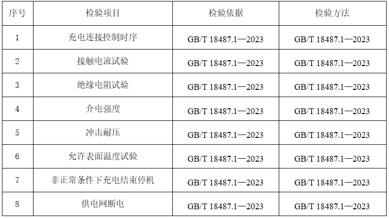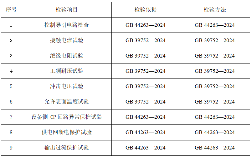 執(zhí)行企業(yè)標(biāo)準(zhǔn)、團(tuán)體標(biāo)準(zhǔn)、地方標(biāo)準(zhǔn)的產(chǎn)品,檢驗(yàn)項(xiàng)目參照上述內(nèi)容執(zhí)行。 3 判定規(guī)則 3.1依據(jù)標(biāo)準(zhǔn) GB/T 18487.1—2023 電動(dòng)汽車傳導(dǎo)充電系統(tǒng) 第1部分:通用要求 GB 39752—2024 電動(dòng)汽車供電設(shè)備安全要求 GB 44263—2024 電動(dòng)汽車傳導(dǎo)充電系統(tǒng)安全要求 現(xiàn)行有效的企業(yè)標(biāo)準(zhǔn)、團(tuán)體標(biāo)準(zhǔn)、地方標(biāo)準(zhǔn)及產(chǎn)品明示質(zhì)量要求。 3.2判定原則 經(jīng)檢驗(yàn),檢驗(yàn)項(xiàng)目全部合格,判定為被抽查產(chǎn)品所檢項(xiàng)目未發(fā)現(xiàn)不合格;檢驗(yàn)項(xiàng)目中任一項(xiàng)或一項(xiàng)以上不合格,判定為被抽查產(chǎn)品不合格。 若被檢產(chǎn)品明示的質(zhì)量要求高于本細(xì)則中檢驗(yàn)項(xiàng)目依據(jù)的標(biāo)準(zhǔn)要求時(shí),應(yīng)按被檢產(chǎn)品明示的質(zhì)量要求判定。 若被檢產(chǎn)品明示的質(zhì)量要求低于本細(xì)則中檢驗(yàn)項(xiàng)目依據(jù)的強(qiáng)制性標(biāo)準(zhǔn)要求時(shí),應(yīng)按照強(qiáng)制性標(biāo)準(zhǔn)要求判定。 若被檢產(chǎn)品明示的質(zhì)量要求低于或包含本細(xì)則中檢驗(yàn)項(xiàng)目依據(jù)的推薦性標(biāo)準(zhǔn)要求時(shí),應(yīng)以被檢產(chǎn)品明示的質(zhì)量要求判定。 若被檢產(chǎn)品明示的質(zhì)量要求缺少本細(xì)則中檢驗(yàn)項(xiàng)目依據(jù)的強(qiáng)制性標(biāo)準(zhǔn)要求時(shí),應(yīng)按照強(qiáng)制性標(biāo)準(zhǔn)要求判定。 若被檢產(chǎn)品明示的質(zhì)量要求缺少本細(xì)則中檢驗(yàn)項(xiàng)目依據(jù)的推薦性標(biāo)準(zhǔn)要求時(shí),該項(xiàng)目不參與判定。
