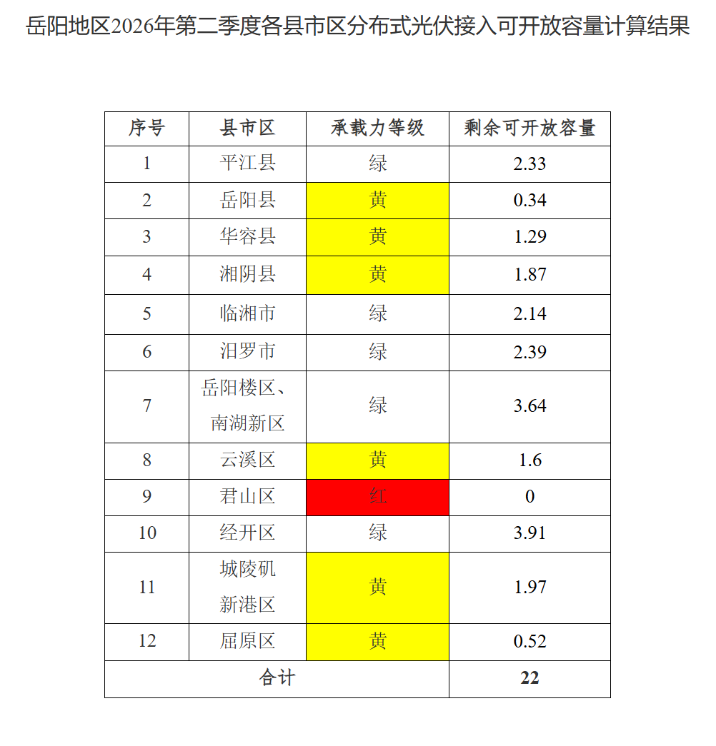 【核心數(shù)據(jù)提煉】日前,湖南岳陽市公布2026年第二季度分布式光伏可開發(fā)容量,國(guó)網(wǎng)湖南電力經(jīng)營(yíng)區(qū)岳陽地區(qū)各縣市區(qū)分布式光伏接入可開放容量為22萬千瓦。截至3月底,岳陽地區(qū)各縣市區(qū)可開放容量為紅色的區(qū)域1個(gè),為君山區(qū);岳陽地區(qū)各縣市區(qū)可開放容量為黃色的區(qū)域6個(gè),為岳陽縣、華容縣、湘陰縣、云溪區(qū)、城陵磯新港區(qū)、屈原區(qū)。 原文如下: 關(guān)于發(fā)布岳陽市2026年第二季度 分布式光伏可開發(fā)容量的通知 各縣市區(qū)發(fā)改局,國(guó)網(wǎng)湖南省電力有限公司岳陽供電分公司,有關(guān)光伏開發(fā)企業(yè): 依據(jù)《湖南省分布式光伏發(fā)電開發(fā)建設(shè)管理實(shí)施細(xì)則》(湘發(fā)改能源規(guī)〔2025〕843號(hào))、國(guó)家能源局電力行業(yè)標(biāo)準(zhǔn)《分布式電源接入電力系統(tǒng)承載力評(píng)估導(dǎo)則》(DL/T 2041-2025),湖南省電力有限公司組織對(duì)各市州經(jīng)營(yíng)區(qū)范圍內(nèi)的2026年二季度各縣市區(qū)分布式光伏接入可開放容量進(jìn)行測(cè)算,岳陽地區(qū)計(jì)算結(jié)果公布如下: 一、可開放容量計(jì)算原則 1.縣市區(qū)可開發(fā)容量以分布式光伏發(fā)電項(xiàng)目不向220千伏電網(wǎng)反送電為限。 2.低電壓等級(jí)設(shè)備可開放容量服從高電壓等級(jí)設(shè)備可開放容量。計(jì)算設(shè)備對(duì)應(yīng)容量時(shí)剔除其供電范圍內(nèi)已接入的其他類型電源的出力。 3.110、35、10千伏電壓等級(jí)公共線路、公共變壓器供電范圍內(nèi)的分布式光伏發(fā)電項(xiàng)目可開放容量(含用戶產(chǎn)權(quán)范圍內(nèi)接入的分布式光伏發(fā)電項(xiàng)目)不得超過本設(shè)備對(duì)應(yīng)容量的80%。 二、總體情況 根據(jù)計(jì)算原則,國(guó)網(wǎng)湖南電力經(jīng)營(yíng)區(qū)岳陽地區(qū)各縣市區(qū)分布式光伏接入可開放容量為22萬千瓦。 三、紅黃區(qū)情況 截至3月底,岳陽地區(qū)各縣市區(qū)可開放容量為紅色的區(qū)域1個(gè),為君山區(qū);岳陽地區(qū)各縣市區(qū)可開放容量為黃色的區(qū)域6個(gè),為岳陽縣、華容縣、湘陰縣、云溪區(qū)、城陵磯新港區(qū)、屈原區(qū)。 四、計(jì)算結(jié)果 截至3月底,岳陽地區(qū)各縣市區(qū)可開放容量計(jì)算結(jié)果見附件。 五、相關(guān)工作要求 1.各縣市區(qū)要結(jié)合可開放容量情況有序推進(jìn)分布式光伏發(fā)電項(xiàng)目的備案和建設(shè),在開展項(xiàng)目備案時(shí)需提醒企業(yè)提前了解項(xiàng)目擬接入的臺(tái)區(qū)、線路、變電站是否存在接入受限情況,對(duì)接入受限的項(xiàng)目應(yīng)及時(shí)退窗并做好解釋工作。 2.各發(fā)電企業(yè)應(yīng)嚴(yán)格落實(shí)本通知、《關(guān)于進(jìn)一步做好分布式光伏行業(yè)管理相關(guān)要求的通知》(湘發(fā)改能源〔2025〕21號(hào))和《湖南省分布式光伏發(fā)電開發(fā)建設(shè)管理實(shí)施細(xì)則》(湘發(fā)改能源規(guī)〔2025〕843號(hào))要求,戶用自然人光伏在取得電網(wǎng)企業(yè)出具的接入系統(tǒng)方案、其他分布式光伏在取得備案手續(xù)和電網(wǎng)企業(yè)出具的接入系統(tǒng)方案后,方可開工建設(shè);手續(xù)不齊全的,不得開工建設(shè)。 3.嚴(yán)禁以自然人名義開發(fā)戶用非自然人光伏電站,請(qǐng)電網(wǎng)企業(yè)辦理項(xiàng)目接網(wǎng)時(shí)認(rèn)真甄別項(xiàng)目類型,縣市區(qū)能源主管部門同步做好監(jiān)管監(jiān)督,如發(fā)現(xiàn)相關(guān)違規(guī)行為的,一律予以嚴(yán)厲查處,并對(duì)違規(guī)企業(yè)項(xiàng)目開發(fā)和并網(wǎng)進(jìn)行限制等。請(qǐng)開發(fā)企業(yè)進(jìn)一步加強(qiáng)行業(yè)自律,備案和接網(wǎng)時(shí)如實(shí)填報(bào)項(xiàng)目信息。 附件:岳陽地區(qū)2026年第二季度各縣市區(qū)分布式光伏接入可開放容量計(jì)算結(jié)果 附件
