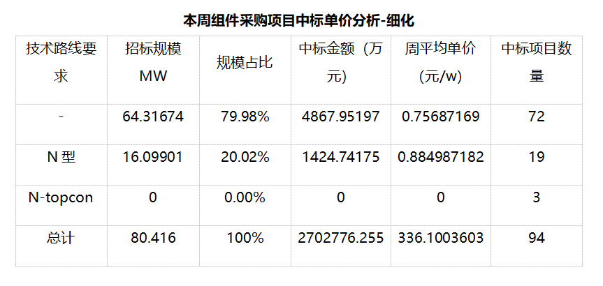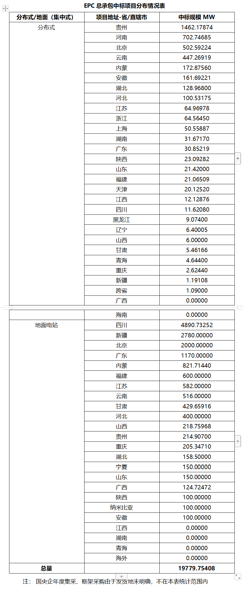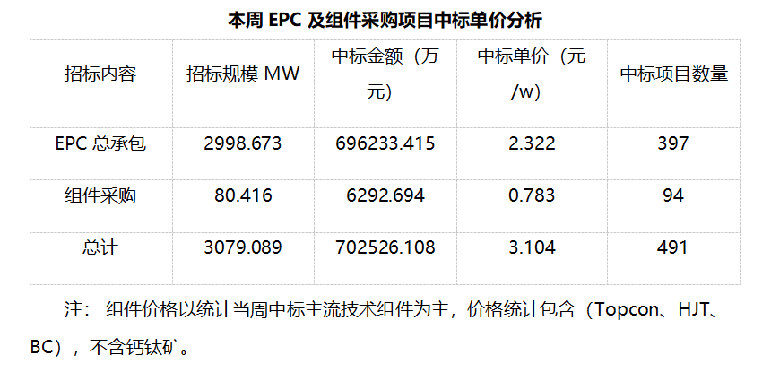 三、EPC總承包及組件采購情況匯總 本月光伏EPC總承包中標(biāo)規(guī)模達2998.673MW,總中標(biāo)金額696233.415萬元,平均中標(biāo)單價為2.322元/W,中標(biāo)數(shù)量397個。 本月光伏組件采購中標(biāo)規(guī)模達80.416 MW,總中標(biāo)金額6292.694 萬元,平均中標(biāo)單價為0.783元/W,中標(biāo)數(shù)量94個。
