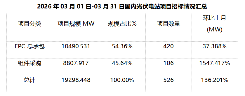 一、光伏項目招標(biāo)情況匯總: 根據(jù)Gessey蓋錫咨詢統(tǒng)計,2026年03月01日-03月31日累計光伏招標(biāo)項目為526個,項目規(guī)模合計為19298.448MW。光伏組件采購招標(biāo)項目為106個,招標(biāo)規(guī)模為8807.917MW,環(huán)比上月1547.417%。EPC總承包招標(biāo)項目為420個,招標(biāo)規(guī)模為10490.531MW,環(huán)比上月37.388%。