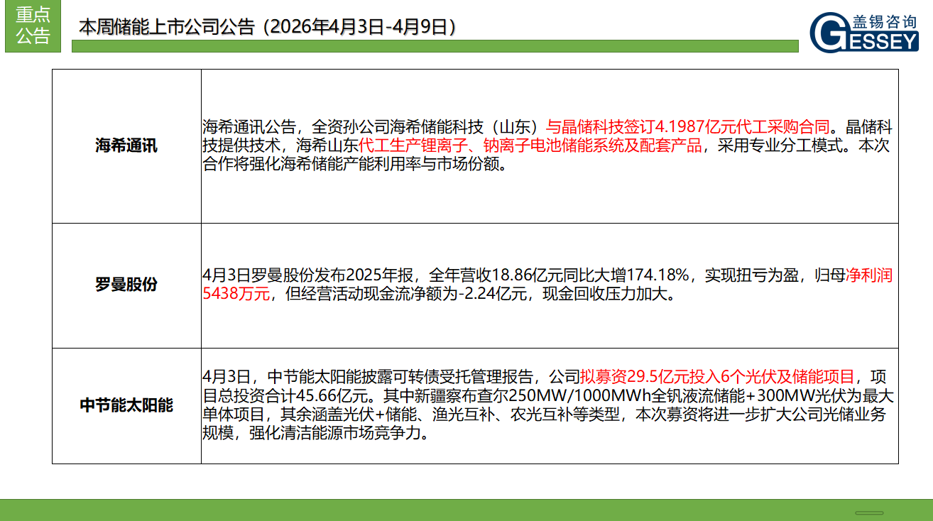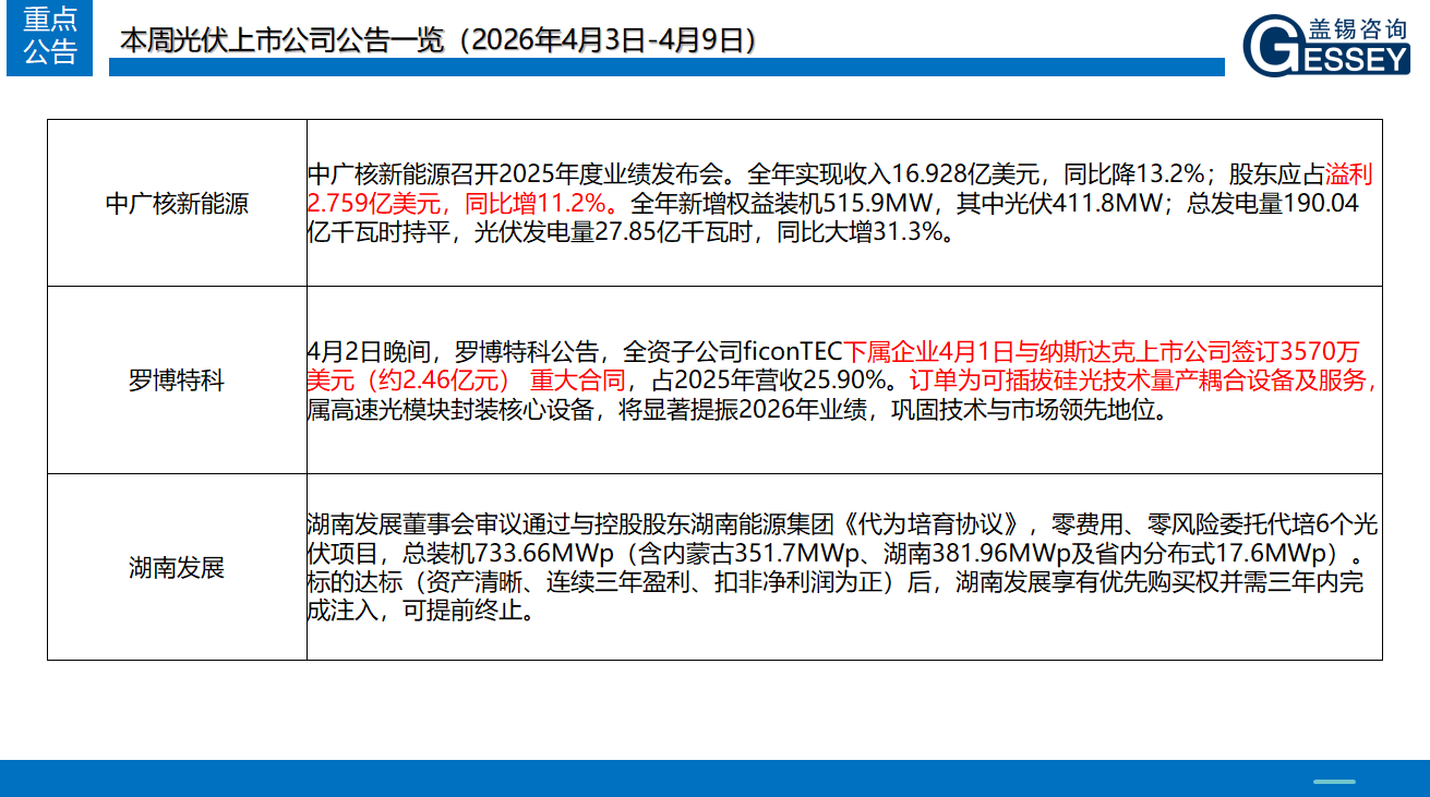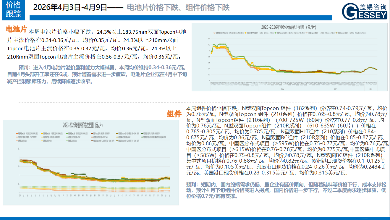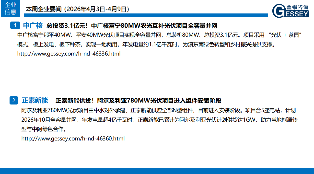 一周光伏市場洞察(2026年4月3日-4月9日)2026-04-10 15:53來源:gessey蓋錫咨詢瀏覽數(shù):152次