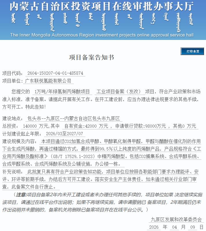 4月9日,1萬噸/年綠氫制丙烯酸項(xiàng)目獲備案。 該項(xiàng)目建設(shè)地點(diǎn)在包頭市--九原區(qū)--內(nèi)蒙古自治區(qū)包頭市九原區(qū),項(xiàng)目單位為廣東聯(lián)悅氫能有限公司,總投資140000萬元。 本項(xiàng)目通過CO2加氫合成甲醇、甲醇氧化制得甲醛,甲醛與醋酸在催化劑的作用下合生成丙烯酸,再通過精餾的方式,最終得到99.5%以上純度的丙烯酸產(chǎn)品,產(chǎn)品規(guī)格符合《工業(yè)用丙烯酸及酯標(biāo)準(zhǔn)》(GB/T 17529.1-2023)中精丙烯酸型。包括CO2捕集系統(tǒng)、合成甲醇系統(tǒng)、合成甲醛系統(tǒng)、合成丙烯酸系統(tǒng)及公輔設(shè)施,辦公樓一棟。 計(jì)劃建設(shè)起止年限:2026/03至2027/07