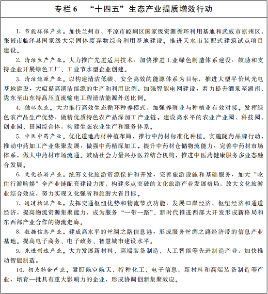 第十五章 積極參與國(guó)內(nèi)國(guó)際經(jīng)濟(jì)循環(huán) 打造優(yōu)質(zhì)供給基地。扭住供給側(cè)結(jié)構(gòu)性改革,注重需求側(cè)管理,貫通生產(chǎn)、分配、流通、消費(fèi)各環(huán)節(jié),提升資源配置效率。加快建設(shè)生產(chǎn)循環(huán)基地、流通循環(huán)樞紐、消費(fèi)循環(huán)市場(chǎng),著力拓展支撐國(guó)內(nèi)大循環(huán)的縱深空間、經(jīng)濟(jì)腹地和通道樞紐。在東數(shù)西算、西電東送、西氣東輸、西油東送、北煤南運(yùn)、南藥北儲(chǔ)等方面發(fā)揮獨(dú)特優(yōu)勢(shì),加快提升要素供給、產(chǎn)品供給和服務(wù)能力。發(fā)揮礦產(chǎn)資源優(yōu)勢(shì),推動(dòng)礦產(chǎn)資源綜合開發(fā)利用。聚焦石化、冶金、裝備制造等重點(diǎn)產(chǎn)業(yè),推動(dòng)上下游產(chǎn)銷對(duì)接,提高基礎(chǔ)化工產(chǎn)品、關(guān)鍵基礎(chǔ)材料、關(guān)鍵裝備保障能力。瞄準(zhǔn)國(guó)家產(chǎn)業(yè)發(fā)展需求,提升集成電路生產(chǎn)能力。加強(qiáng)制種育種基地和草業(yè)基地建設(shè)。 構(gòu)建現(xiàn)代流通體系。強(qiáng)化流通樞紐功能,依托中歐、南亞、西部陸海新通道班列和國(guó)際航空貨運(yùn)航線,暢通鏈接國(guó)內(nèi)、面向國(guó)際物流大通道。積極引進(jìn)國(guó)內(nèi)電商快遞物流頭部企業(yè)在甘設(shè)立區(qū)域總部、新業(yè)態(tài)總部,培育壯大現(xiàn)代物流企業(yè),推動(dòng)物流業(yè)與制造業(yè)、交通運(yùn)輸業(yè)深度融合發(fā)展。促進(jìn)物流信息化、標(biāo)準(zhǔn)化建設(shè),大力發(fā)展電商物流、智慧物流、港口物流、冷鏈物流、綠色物流,降低物流成本,推動(dòng)物流業(yè)提質(zhì)增效。打造西北快遞物流集散中心,加強(qiáng)智慧型物流園區(qū)建設(shè)。加快現(xiàn)代流通體系綜合示范縣(市)建設(shè),推進(jìn)“快遞下鄉(xiāng)”“快遞進(jìn)村”,完善城鄉(xiāng)物流網(wǎng)絡(luò)體系。力爭(zhēng)到2025年,物流相關(guān)行業(yè)增加值占全省地區(qū)生產(chǎn)總值比重達(dá)到20%。
