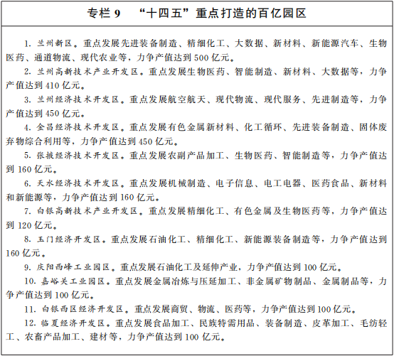 打造百億園區(qū)。依托各級(jí)開發(fā)區(qū)等重大平臺(tái)和載體,全面提升園區(qū)基礎(chǔ)設(shè)施和服務(wù)能力,積極承接產(chǎn)業(yè)轉(zhuǎn)移,吸納“飛地經(jīng)濟(jì)”。抓住承接產(chǎn)業(yè)轉(zhuǎn)移重要窗口期,建立承接產(chǎn)業(yè)轉(zhuǎn)移協(xié)調(diào)落實(shí)機(jī)制,完善信息對(duì)接、權(quán)益分享、稅收分成體系,千方百計(jì)承接符合產(chǎn)業(yè)政策、環(huán)保政策、適合我省發(fā)展的產(chǎn)業(yè)。充分發(fā)揮要素成本、資源和通道等優(yōu)勢(shì),集中優(yōu)質(zhì)要素向園區(qū)配置,引導(dǎo)產(chǎn)業(yè)項(xiàng)目在園區(qū)落地。加強(qiáng)銜接對(duì)接、定點(diǎn)招商、精準(zhǔn)招商,落地一批大項(xiàng)目好項(xiàng)目,推動(dòng)產(chǎn)業(yè)園區(qū)化、園區(qū)產(chǎn)業(yè)化。重點(diǎn)打造12個(gè)百億園區(qū)。積極培育發(fā)展?jié)摿^大的隴西經(jīng)濟(jì)開發(fā)區(qū)、武威民勤能源化工工業(yè)集中區(qū)、金塔工業(yè)集中區(qū)、定西經(jīng)濟(jì)開發(fā)區(qū)、平?jīng)龉I(yè)園區(qū)、隴南經(jīng)濟(jì)開發(fā)區(qū)、甘南合作生態(tài)產(chǎn)業(yè)園區(qū)等,成為區(qū)域產(chǎn)業(yè)集聚重要平臺(tái)。