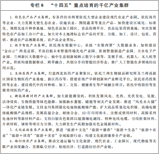 積極謀劃未來產(chǎn)業(yè)。在有基礎(chǔ)、有優(yōu)勢(shì)、有市場(chǎng)、有空間的產(chǎn)業(yè)領(lǐng)域提前謀劃,率先布局,搶占發(fā)展先機(jī)。加快推進(jìn)大健康產(chǎn)業(yè)系統(tǒng)設(shè)計(jì)和實(shí)施、靶向藥物開發(fā)、真空鍍膜技術(shù)延伸利用、凹凸棒產(chǎn)業(yè)發(fā)展,逐步形成上下游配套的產(chǎn)業(yè)發(fā)展體系。對(duì)接國(guó)家石墨烯“一條龍”應(yīng)用計(jì)劃,發(fā)展功能齊備、可靠性好、性價(jià)比優(yōu)的石墨烯化工材料、晶質(zhì)石墨產(chǎn)業(yè)。積極加強(qiáng)高分衛(wèi)星、北斗導(dǎo)航技術(shù)延伸應(yīng)用開發(fā),培育一批未來產(chǎn)業(yè)。積極對(duì)接量子通信等尖端產(chǎn)業(yè),搶占發(fā)展制高點(diǎn)。 第十一章 打造優(yōu)勢(shì)產(chǎn)業(yè)集群 培育千億產(chǎn)業(yè)集群。實(shí)施產(chǎn)業(yè)基礎(chǔ)高級(jí)化和產(chǎn)業(yè)鏈現(xiàn)代化攻堅(jiān)戰(zhàn),開展重點(diǎn)和優(yōu)勢(shì)產(chǎn)業(yè)鏈培育攻堅(jiān)行動(dòng),促進(jìn)優(yōu)勢(shì)產(chǎn)業(yè)鏈由低端向高端邁進(jìn)、由短鏈向長(zhǎng)鏈發(fā)展。集中土地、人才、資本等要素資源,綜合運(yùn)用財(cái)政、金融、稅收、產(chǎn)業(yè)等政策,在鞏固提升石油化工、有色冶金產(chǎn)業(yè)集群基礎(chǔ)上,著力培育特色農(nóng)產(chǎn)品、數(shù)字智能、生物醫(yī)藥、新能源新材料、文旅康養(yǎng)、路衍經(jīng)濟(jì)等千億級(jí)產(chǎn)業(yè)集群。