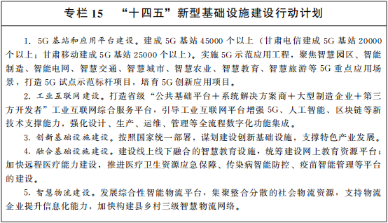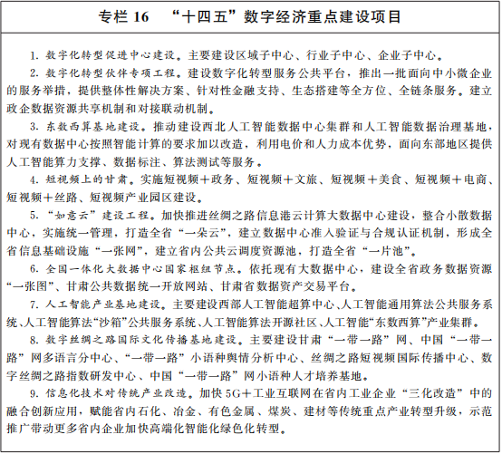 主動(dòng)融入國(guó)內(nèi)大市場(chǎng)。發(fā)揮甘肅承東啟西、連南通北區(qū)位優(yōu)勢(shì),推動(dòng)形成中心帶動(dòng)、多點(diǎn)支撐、縱橫成線的省域開放局面。在推進(jìn)西北經(jīng)濟(jì)一體化中發(fā)揮中心聯(lián)通功能,在有效連接西南大市場(chǎng)中發(fā)揮樞紐通道作用,在推進(jìn)沿黃流域省區(qū)協(xié)同發(fā)展中發(fā)揮銜接推動(dòng)功能。加強(qiáng)與沿黃省區(qū)合作交流,共建沿黃經(jīng)濟(jì)帶。強(qiáng)化與成渝地區(qū)雙城經(jīng)濟(jì)圈合作,積極拓展川渝大市場(chǎng),大力推進(jìn)隴貨入川入渝。深化與東部地區(qū)全面合作,逐步形成“甘肅資源+東部企業(yè)”“甘肅產(chǎn)品+東部市場(chǎng)”“甘肅基地+東部總部”“甘肅制造+東部研發(fā)”等多元合作模式,促進(jìn)需求升級(jí)與供給匹配協(xié)同共進(jìn)、省內(nèi)與省外錯(cuò)位互補(bǔ)、自身發(fā)展與國(guó)家需要精準(zhǔn)結(jié)合的高效循環(huán)。 有效拓展國(guó)際市場(chǎng)。發(fā)揮甘肅融入國(guó)際循環(huán)的重要通道作用,加強(qiáng)與國(guó)際市場(chǎng)聯(lián)通,促進(jìn)內(nèi)需和外需、進(jìn)口和出口、利用外資和對(duì)外投資協(xié)同發(fā)展。把推進(jìn)國(guó)際貿(mào)易作為增強(qiáng)全省經(jīng)濟(jì)實(shí)力的重要推動(dòng)力量,多措并舉努力實(shí)現(xiàn)外貿(mào)總量較大增長(zhǎng)。積極開拓“一帶一路”沿線國(guó)家市場(chǎng),提升工業(yè)品、農(nóng)產(chǎn)品、裝備制造、生物醫(yī)藥、加工貿(mào)易、服務(wù)貿(mào)易出口競(jìng)爭(zhēng)力。推進(jìn)生產(chǎn)基地和物流中心建設(shè),形成聯(lián)動(dòng)西北、服務(wù)全國(guó)、輻射中西亞、中東歐和東盟的商品集散地。加強(qiáng)跨境電商、市場(chǎng)采購(gòu)、外貿(mào)綜合服務(wù)等新型貿(mào)易業(yè)態(tài)發(fā)展,努力培育以技術(shù)、品牌、質(zhì)量、服務(wù)為核心的貿(mào)易競(jìng)爭(zhēng)新優(yōu)勢(shì)。加強(qiáng)旱作農(nóng)業(yè)技術(shù)、育種技術(shù)和農(nóng)機(jī)向中亞、西亞和非洲出口。穩(wěn)定擴(kuò)大銅精礦、鎳精礦、鋅精礦、鐵礦石等資源性產(chǎn)品進(jìn)口,提高企業(yè)資源供給水平,保障原材料產(chǎn)業(yè)供應(yīng)鏈安全穩(wěn)定。用足用好國(guó)家鼓勵(lì)進(jìn)口貼息政策,擴(kuò)大先進(jìn)技術(shù)、設(shè)備和關(guān)鍵零部件進(jìn)口,提升全省產(chǎn)業(yè)技術(shù)含量和裝備水平。著力提升利用外資水平,擴(kuò)大利用外資規(guī)模,重點(diǎn)投向文化旅游、現(xiàn)代農(nóng)業(yè)、高新技術(shù)產(chǎn)業(yè)和公共設(shè)施領(lǐng)域。鼓勵(lì)外資建設(shè)交通、物流、教育、醫(yī)療等設(shè)施。擴(kuò)大金融業(yè)開放。加強(qiáng)對(duì)外貿(mào)易人才培養(yǎng)、政策研究、輿情收集、決策咨詢等服務(wù)。 第五篇 推動(dòng)數(shù)字化轉(zhuǎn)型,加快建設(shè)數(shù)字甘肅 搶抓數(shù)字時(shí)代機(jī)遇,推進(jìn)經(jīng)濟(jì)社會(huì)數(shù)字化全面轉(zhuǎn)型,逐步形成以新基建創(chuàng)造新消費(fèi)、打造新產(chǎn)業(yè)、培育新動(dòng)能、聯(lián)接新絲路、優(yōu)化新治理的嶄新格局,為建設(shè)高質(zhì)量發(fā)展、高品質(zhì)生活、高水平開放、高效能治理的“新甘肅”打造“新基座”。 第十六章 發(fā)展數(shù)字經(jīng)濟(jì) 加快新基建步伐。打造面向“一帶一路”沿線國(guó)家和地區(qū)的通信樞紐、區(qū)域信息匯集中心和大數(shù)據(jù)服務(wù)輸出地,加快以5G等新一代信息技術(shù)為代表的新型基礎(chǔ)設(shè)施建設(shè)。優(yōu)化骨干傳輸網(wǎng)絡(luò),建設(shè)蘭州至成都第二路由等國(guó)家一級(jí)干線。健全基礎(chǔ)網(wǎng)絡(luò)架構(gòu),構(gòu)建覆蓋全省、技術(shù)先進(jìn)、安全可靠的信息通信網(wǎng)絡(luò)。爭(zhēng)取到2025年實(shí)現(xiàn)5G網(wǎng)絡(luò)人口覆蓋率達(dá)到50%以上。推進(jìn)工業(yè)互聯(lián)網(wǎng)建設(shè),完成IPv6規(guī)模部署。加強(qiáng)新技術(shù)基礎(chǔ)設(shè)施和算力基礎(chǔ)設(shè)施建設(shè),建設(shè)區(qū)域智能計(jì)算中心,合理布局大數(shù)據(jù)中心,積極開展國(guó)際物聯(lián)網(wǎng)骨干直聯(lián)點(diǎn)、國(guó)際通信業(yè)務(wù)出入口局前期工作。發(fā)揮我省能源豐富、氣候適宜的優(yōu)勢(shì),積極爭(zhēng)取在甘肅布局全國(guó)一體化大數(shù)據(jù)中心國(guó)家樞紐節(jié)點(diǎn)。開展工業(yè)互聯(lián)網(wǎng)標(biāo)識(shí)解析二級(jí)節(jié)點(diǎn)應(yīng)用和試點(diǎn)示范工程。