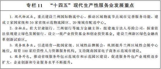 第十三章 積極發(fā)展現(xiàn)代服務(wù)業(yè) 推動(dòng)生產(chǎn)性服務(wù)業(yè)融合化發(fā)展。加強(qiáng)生產(chǎn)性服務(wù)業(yè)向?qū)I(yè)化和價(jià)值鏈高端延伸,推動(dòng)現(xiàn)代服務(wù)業(yè)同先進(jìn)制造業(yè)、現(xiàn)代農(nóng)業(yè)深度融合。壯大金融服務(wù)、信息服務(wù)、商務(wù)服務(wù)、專業(yè)生產(chǎn)服務(wù)、服務(wù)外包等產(chǎn)業(yè)規(guī)模,打造西北生產(chǎn)性服務(wù)業(yè)高地。建設(shè)面向中西亞的國(guó)際物流中心,著力發(fā)展航空物流、國(guó)際多式聯(lián)運(yùn)、快遞物流、保稅物流,打造輻射東中西、連接境內(nèi)外的物流樞紐。加快發(fā)展研發(fā)設(shè)計(jì)、檢驗(yàn)檢測(cè)、節(jié)能環(huán)保服務(wù)、售后服務(wù)等服務(wù)業(yè),引導(dǎo)生產(chǎn)企業(yè)加快服務(wù)環(huán)節(jié)專業(yè)化分離和外包。