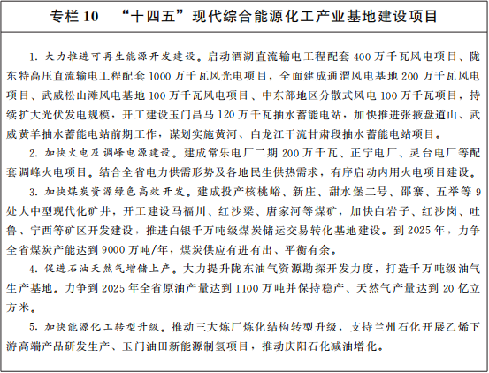 第十二章 建設(shè)綠色綜合能源化工產(chǎn)業(yè)基地 構(gòu)建能源資源開發(fā)利用新格局。圍繞落實(shí)國(guó)家2030年前碳達(dá)峰、2060年前碳中和目標(biāo),堅(jiān)持清潔低碳、安全高效,立足資源稟賦和區(qū)位優(yōu)勢(shì),大力推動(dòng)非化石能源持續(xù)快速增長(zhǎng),加快調(diào)整優(yōu)化產(chǎn)業(yè)結(jié)構(gòu)、能源結(jié)構(gòu),大力淘汰落后產(chǎn)能、優(yōu)化存量產(chǎn)能,推動(dòng)煤炭消費(fèi)盡早達(dá)峰。推廣煤炭綠色智能開采、推進(jìn)煤電清潔高效發(fā)展、加大油氣勘探開發(fā)和優(yōu)勢(shì)礦產(chǎn)資源開發(fā)利用、完善能源儲(chǔ)運(yùn)體系,著力打造國(guó)家重要的現(xiàn)代能源綜合生產(chǎn)基地、儲(chǔ)備基地、輸出基地和戰(zhàn)略通道。 大力發(fā)展新能源。堅(jiān)持集中式和分布式并重、電力外送與就地消納結(jié)合,著力增加風(fēng)電、光伏發(fā)電、太陽能熱發(fā)電、抽水蓄能發(fā)電等非化石能源供給,形成風(fēng)光水火儲(chǔ)一體化協(xié)調(diào)發(fā)展格局。持續(xù)推進(jìn)河西特大型新能源基地建設(shè),進(jìn)一步拓展酒泉千萬千瓦級(jí)風(fēng)電基地規(guī)模,打造金(昌)張(掖)武(威)千萬千瓦級(jí)風(fēng)光電基地,積極開展白銀復(fù)合型能源基地建設(shè)前期工作。加快酒湖直流、隴電入魯配套外送風(fēng)光電等重點(diǎn)項(xiàng)目建設(shè)。持續(xù)擴(kuò)大光伏發(fā)電規(guī)模,推動(dòng)“光伏+”多元化發(fā)展。開工建設(shè)玉門昌馬等抽水蓄能電站,謀劃實(shí)施黃河、白龍江干流甘肅段抽水蓄能電站項(xiàng)目。加快推進(jìn)光熱示范項(xiàng)目建設(shè),實(shí)現(xiàn)光熱發(fā)電與風(fēng)光電協(xié)同無補(bǔ)貼發(fā)展。推動(dòng)儲(chǔ)能成本進(jìn)一步降低和多元利用,開展風(fēng)儲(chǔ)、光儲(chǔ)、分布式微電網(wǎng)儲(chǔ)和大電網(wǎng)儲(chǔ)等發(fā)儲(chǔ)用一體化商業(yè)應(yīng)用試點(diǎn)示范。建設(shè)清潔能源交易大數(shù)據(jù)中心。大力發(fā)展生物質(zhì)能。到2025年,全省風(fēng)光電裝機(jī)達(dá)到5000萬千瓦以上,可再生能源裝機(jī)占電源總裝機(jī)比例接近65%,非化石能源占一次能源消費(fèi)比重超過30%,外送電新能源占比達(dá)到30%以上。 推進(jìn)傳統(tǒng)能源綠色清潔高效發(fā)展。加大煤炭油氣勘探、綜合開發(fā)和清潔高效利用力度,有序釋放先進(jìn)產(chǎn)能。推動(dòng)隴東綜合能源化工基地高質(zhì)量發(fā)展,著力打造以煤炭、電力產(chǎn)業(yè)為支撐的國(guó)家大型煤炭基地、千萬千瓦級(jí)火電基地、千萬噸級(jí)油氣生產(chǎn)基地、煤化工基地,重點(diǎn)建設(shè)靈臺(tái)、寧正、沙井子等礦區(qū)。充分發(fā)揮煤電基礎(chǔ)性、調(diào)節(jié)性電源作用,做好煤電布局和結(jié)構(gòu)優(yōu)化,加快推進(jìn)配套調(diào)峰火電和煤源項(xiàng)目建設(shè),有序啟動(dòng)內(nèi)用火電及熱電聯(lián)產(chǎn)項(xiàng)目,深入推進(jìn)火電機(jī)組靈活性改造,充分挖掘系統(tǒng)調(diào)峰能力,持續(xù)加大電力外送。多措并舉提升煤電機(jī)組運(yùn)行效率,推動(dòng)煤電行業(yè)清潔高效發(fā)展。 建設(shè)綠色化工生產(chǎn)基地。堅(jiān)持“穩(wěn)油增氣、持續(xù)穩(wěn)產(chǎn)”,實(shí)施石油化工產(chǎn)業(yè)鏈水平提升行動(dòng),加快石化企業(yè)現(xiàn)有裝置和產(chǎn)品結(jié)構(gòu)調(diào)整,推進(jìn)新產(chǎn)品拓展和化工產(chǎn)業(yè)鏈延伸,加快慶陽石化、蘭州石化等煉廠升級(jí)改造。推進(jìn)煤炭安全綠色智能化開采和清潔高效低碳集約化利用,加速傳統(tǒng)煤化工向現(xiàn)代精細(xì)煤化工轉(zhuǎn)型升級(jí),有效提升煤基產(chǎn)品附加值,打造煤基多聯(lián)產(chǎn)循環(huán)經(jīng)濟(jì)體系。依托蘭州新區(qū)、金昌、白銀、玉門、華亭、高臺(tái)等化工園區(qū),培育發(fā)展高端化工產(chǎn)品、精細(xì)化工新材料、化工中間體等產(chǎn)業(yè)集群。