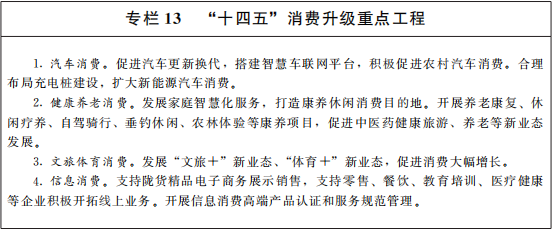 增強(qiáng)消費(fèi)基礎(chǔ)性作用。探索建立擴(kuò)大消費(fèi)長(zhǎng)效機(jī)制,大力培育新型消費(fèi),鼓勵(lì)綠色消費(fèi),提升傳統(tǒng)消費(fèi),適當(dāng)增加公共消費(fèi)。加強(qiáng)需求側(cè)管理,推動(dòng)消費(fèi)結(jié)構(gòu)由生存性向發(fā)展型、樂享型邁進(jìn),不斷滿足社會(huì)大眾多元化、多層次的消費(fèi)需求。拓展遠(yuǎn)程教育、遠(yuǎn)程醫(yī)療、健康檢測(cè)、數(shù)字文化等服務(wù)空間。加強(qiáng)政策支持,大力發(fā)展自駕游消費(fèi)和特色體育消費(fèi)。建設(shè)一批聚集效應(yīng)顯著、文化內(nèi)涵豐富、建筑風(fēng)格鮮明、拉動(dòng)消費(fèi)明顯的商業(yè)和文化旅游特色街區(qū),促進(jìn)文化消費(fèi)提質(zhì)升級(jí)。積極打造城市夜經(jīng)濟(jì)。探索構(gòu)建“互聯(lián)網(wǎng)+”消費(fèi)生態(tài)體系,打造線上消費(fèi)新模式。大力開發(fā)農(nóng)村消費(fèi)市場(chǎng),鼓勵(lì)康養(yǎng)服務(wù)向農(nóng)村延伸。深入實(shí)施放心消費(fèi)行動(dòng),持續(xù)優(yōu)化消費(fèi)環(huán)境,努力讓消費(fèi)者明白消費(fèi)、放心消費(fèi)、快樂消費(fèi)。落實(shí)帶薪休假制度,擴(kuò)大節(jié)假日消費(fèi)。