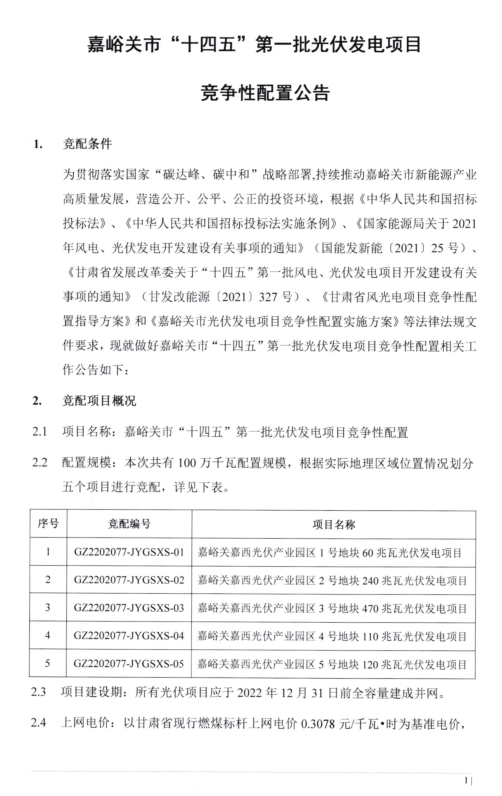 甘肅嘉峪關(guān)十四五第一批光伏競配:1GW 光伏配儲20% /2h3月10日,嘉峪關(guān)政府網(wǎng)發(fā)布了嘉峪關(guān)市“十四五”第一批光伏發(fā)電項目競爭性配置公告。公告中提出此次共有100萬千瓦配置規(guī)模,分為五個項目進(jìn)行競配。申報項目儲能規(guī)模不低于項目規(guī)模20%,儲能放電時長不小于2小時,則預(yù)計配備儲能200MW/400MWh。 公告中提出所有光伏項目應(yīng)于2022年12月31日前全容量建成并網(wǎng)。上網(wǎng)電價以甘肅現(xiàn)行燃煤標(biāo)桿上網(wǎng)電價0.3078元/千瓦時為基準(zhǔn)電價,申報電價不得高于基準(zhǔn)電價。 原文如下: