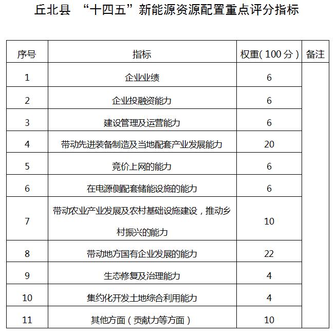 根據(jù)文山州相關(guān)文件要求,結(jié)合丘北縣實(shí)際情況,對資源進(jìn)行了相應(yīng)調(diào)整。 以上容量為規(guī)劃裝機(jī),需投資主體根據(jù)政策進(jìn)一步排查落實(shí)。 (四)項(xiàng)目投資及建設(shè)時間:該項(xiàng)目初步估算總投資在53億元人民幣,建設(shè)時間為“十四五”期間。 二、配置原則 (一)堅持統(tǒng)籌資源,協(xié)調(diào)發(fā)展。統(tǒng)籌規(guī)劃發(fā)展和資源配置規(guī)模,做好光伏項(xiàng)目開發(fā)與生態(tài)環(huán)境保護(hù)、土地綜合利用的關(guān)系,減少土地資源的非必要占用,高效、合理配置光伏資源。 (二)堅持生態(tài)優(yōu)先,創(chuàng)新模式。光伏發(fā)電項(xiàng)目嚴(yán)禁占用生態(tài)保護(hù)紅線、基本農(nóng)田等國家法律法規(guī)和規(guī)劃明確禁止建設(shè)區(qū)域。鼓勵在保護(hù)生態(tài)的前提下,結(jié)合土地治理、種植業(yè)發(fā)展、畜牧業(yè)發(fā)展等方式,因地制宜建設(shè)各類“光伏+”綜合利用項(xiàng)目,探索光伏開發(fā)新模式新業(yè)態(tài)。 (三)堅持市場導(dǎo)向,公開優(yōu)選。充分發(fā)揮市場在資源配置過程中的決定性作用,堅持公開、公平、公正的原則,面向社會公開擇優(yōu)選擇項(xiàng)目投資開發(fā)主體,優(yōu)先支持“基地化”項(xiàng)目對光伏資源的需求,支持地方國有企業(yè)依法合規(guī)參與能源資源開發(fā)利用,配置2-3家具有較強(qiáng)實(shí)力合作投資開發(fā)主體。 (四)堅持實(shí)力優(yōu)先,合作共贏。堅持引入行業(yè)龍頭企業(yè),以綜合實(shí)力、信譽(yù)良好、地方貢獻(xiàn)優(yōu)先,重點(diǎn)加強(qiáng)與本土國資平臺企業(yè)合作,助力農(nóng)村基礎(chǔ)設(shè)施建設(shè),實(shí)現(xiàn)互惠共贏。 (五)堅持資源利用,帶動發(fā)展。以“新能源+”模式(+特色產(chǎn)業(yè)、+生態(tài)修復(fù)、+綠色食品、+鄉(xiāng)村振興等),重點(diǎn)帶動中藥材、新型農(nóng)業(yè)等產(chǎn)業(yè),以及帶動生態(tài)修復(fù)、助力鄉(xiāng)村振興等。 (六)堅持產(chǎn)業(yè)帶動,提質(zhì)升級。堅持資源開發(fā)與產(chǎn)業(yè)培育融合發(fā)展,促進(jìn)產(chǎn)業(yè)結(jié)構(gòu)綠色轉(zhuǎn)型升級高質(zhì)量發(fā)展,帶動先進(jìn)裝備制造及當(dāng)?shù)嘏涮桩a(chǎn)業(yè)發(fā)展,相互促進(jìn)協(xié)調(diào)發(fā)展。 三、合作模式 (一)政府授權(quán),企業(yè)自主建設(shè)、運(yùn)營管理,通過公開招商比選談判方式確定項(xiàng)目投資業(yè)主。 (二)接受獨(dú)資、合資或合作聯(lián)合體等多種方式。 四、申報條件 綜合考慮市場良性競爭、企業(yè)新能源開發(fā)建設(shè)的實(shí)力以及地方國有企業(yè)參與等因素,對申報企業(yè)資格提出如下要求: 一是必須是合法注冊,具有獨(dú)立法人資格的企業(yè),且未列入失信聯(lián)合懲戒對象名單。 二是同一家集團(tuán)公司須以集團(tuán)名義或只能授權(quán)一戶下屬二級公司參與競爭。 三是組建聯(lián)合體參與競爭的,聯(lián)合體最多為兩戶企業(yè)共同組建。 四是單戶企業(yè)參與競爭的,企業(yè)凈資產(chǎn)應(yīng)達(dá)到10億元及以上;組建聯(lián)合體參與競爭的,牽頭企業(yè)凈資產(chǎn)應(yīng)達(dá)到10億元及以上;企業(yè)在國內(nèi)具有新能源并網(wǎng)在運(yùn)裝機(jī)容量至少達(dá)到50萬千瓦(聯(lián)合體參與競爭的,其中一戶企業(yè)應(yīng)達(dá)到此項(xiàng)要求)。 五、申報材料要求 申報企業(yè)需要提供包括但不限于如下材料: 1.申報企業(yè)營業(yè)執(zhí)照。聯(lián)合體方式申報的,應(yīng)提供已簽署、蓋章的聯(lián)合體協(xié)議及出資各方營業(yè)執(zhí)照,聯(lián)合體協(xié)議中應(yīng)明確各方全稱及出資比例。 2.申報企業(yè)基本情況。包括申報企業(yè)主營業(yè)務(wù)、總資產(chǎn)、資產(chǎn)負(fù)債、股東構(gòu)成、凈資產(chǎn)等內(nèi)容,并提供經(jīng)審計的前2個年度財務(wù)報告。申報企業(yè)為聯(lián)合體的,應(yīng)按照上述要求提供出資各方的基本情況。 3.申報企業(yè)業(yè)績水平。包括申報企業(yè)國內(nèi)、省內(nèi)已投運(yùn)的新能源項(xiàng)目的總裝機(jī)。分類提供截至上年度末已并網(wǎng)的新能源項(xiàng)目發(fā)電業(yè)務(wù)許可證。申報企業(yè)為聯(lián)合體的,應(yīng)按照上述要求提供出資各方的業(yè)績水平證明材料。 4.一個企業(yè)集團(tuán)只能有一個投資主體。申報企業(yè)代表所屬集團(tuán)參與競爭配置的,在提供企業(yè)相關(guān)材料時,應(yīng)同時提供集團(tuán)授權(quán)書,以證明其參與市場化競爭配置身份的唯一性。 5.《丘北縣“十四五”新能源資源配置重點(diǎn)評分指標(biāo)》(附件1)中每項(xiàng)指標(biāo)的證明文件材料。 6.關(guān)于項(xiàng)目備案、開工、建成及并網(wǎng)時間的承諾。 7.關(guān)于所有出資人未因失信納入“信用中國"黑名單的承諾。 8.關(guān)于申報材料真實(shí)性的承諾。 六、其他要求 (一)通過公開優(yōu)選投資開發(fā)主體通告,公平、公正競爭擇優(yōu)引進(jìn)選擇綜合能力強(qiáng)、技術(shù)水平高、經(jīng)營業(yè)績好、誠信記錄優(yōu)、具備帶動當(dāng)?shù)禺a(chǎn)業(yè)發(fā)展的開發(fā)企業(yè)。請各企業(yè)