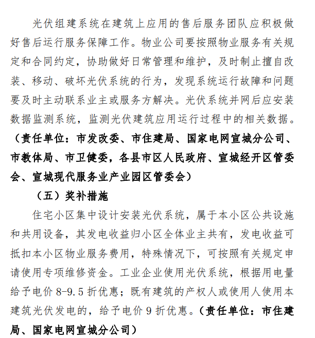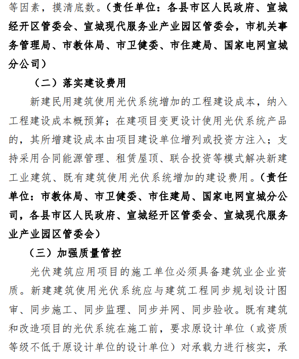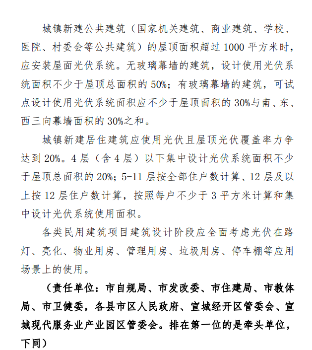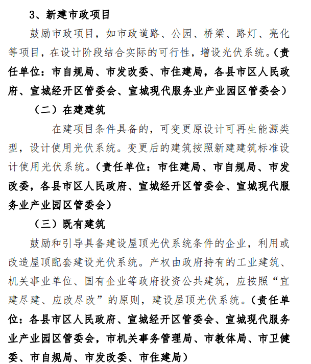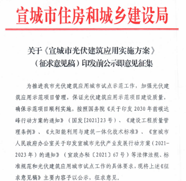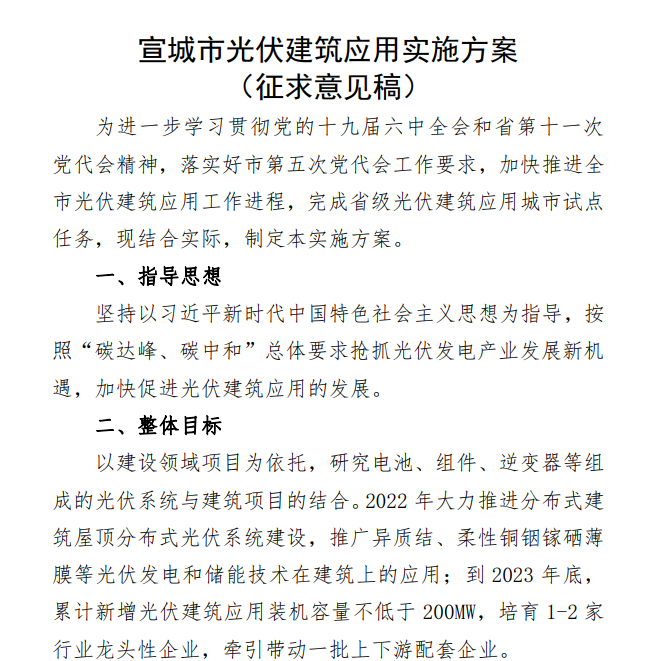 4月13日,宣城市住房和城鄉(xiāng)建設(shè)局發(fā)布《宣城市光伏建筑應(yīng)用實施方案》(征求意見稿),根據(jù)征求意見稿,宣城市將以建設(shè)領(lǐng)域項目為依托,研究電池、組件、逆變器等組成的光伏系統(tǒng)與建筑項目的結(jié)合。2022年大力推進(jìn)分布式建筑屋頂分布式光伏系統(tǒng)建設(shè),推廣異質(zhì)結(jié)、柔性銅銦鎵硒薄膜等光伏發(fā)電和儲能技術(shù)在建筑上的應(yīng)用;到2023年底,累計新增光伏建筑應(yīng)用裝機容量不低于200MW,培育1-2家行業(yè)龍頭性企業(yè),牽引帶動一批上下游配套企業(yè)。 鼓勵政府、企業(yè)、金融機構(gòu)、技術(shù)機構(gòu)等聯(lián)合組建產(chǎn)業(yè)聯(lián)盟,不斷探索光伏建筑應(yīng)用的管理模式,將“就地消納”、“余電上網(wǎng)”、光儲、碳交易等利用方式結(jié)合,推進(jìn)光伏建筑應(yīng)用項目的建設(shè)和發(fā)展。