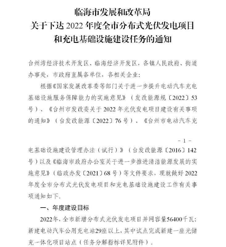 近日,浙江省臨海市發(fā)改局下發(fā)2022年度全市分布式光伏發(fā)電項目和充電基礎(chǔ)設(shè)施建設(shè)任務(wù),2022年臨海市新增分布式光伏項目并網(wǎng)容量56.4MW,新建電動汽車公用充電站29座以上,其中試點完成新建一座光儲充一體化項目站點。